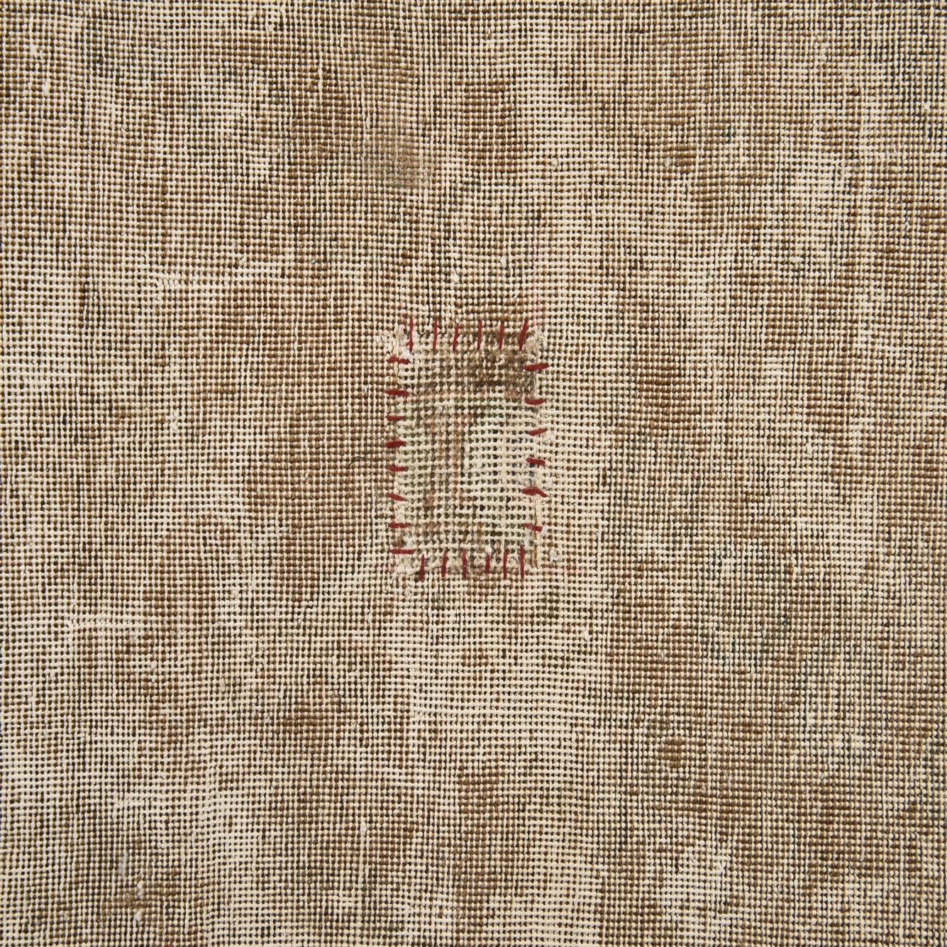 A 6x9 rectangular Ultra Vintage rug in shades of brown and tan, featuring a distressed Persian pattern with subtle abstract elements and visible hand-stitched repairs, suitable for a living room.