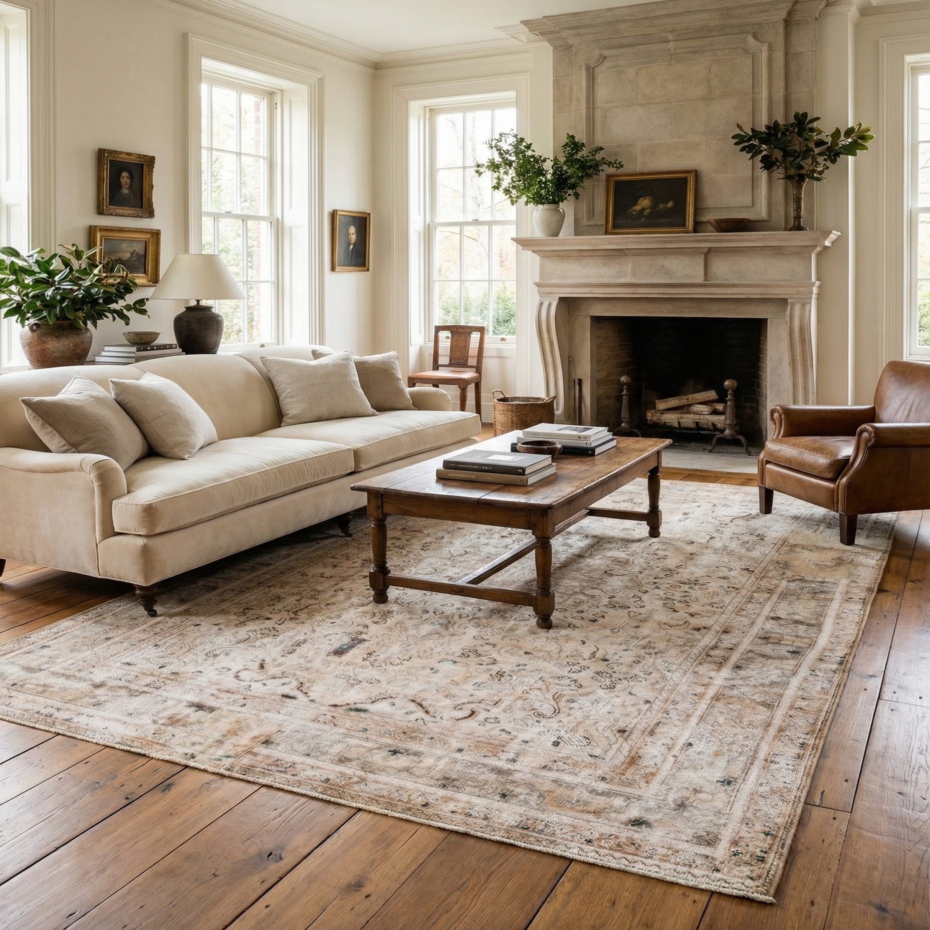 A 6x9 rectangular Rugs.com Ultra Vintage rug in browns and tans, featuring a distressed Persian medallion pattern.