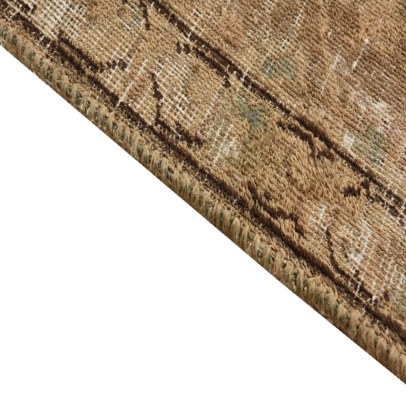 A softly worn, vintage-inspired field rests on a light brown ground, where a faded medallion and delicate floral motifs emerge in ivory and warm brown tones. Narrow, double-lined borders frame the composition while subtle navy blue accents punctuate the pattern, giving it depth without overpowering the palette. Hand-knotted of 100% wool, the rug has a low to medium pile with a tactile, slightly uneven surface that highlights the handcrafted construction and accentuates the distressed, lived-in look.