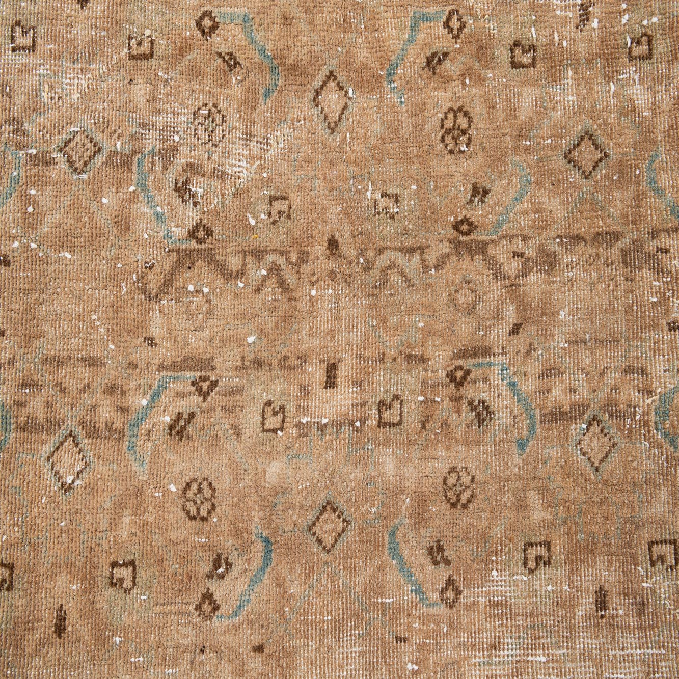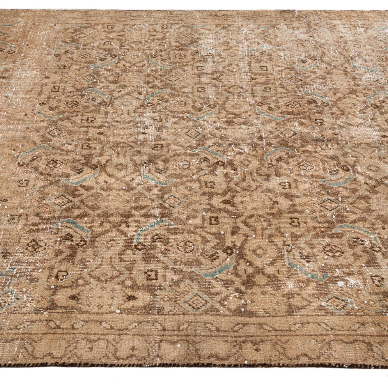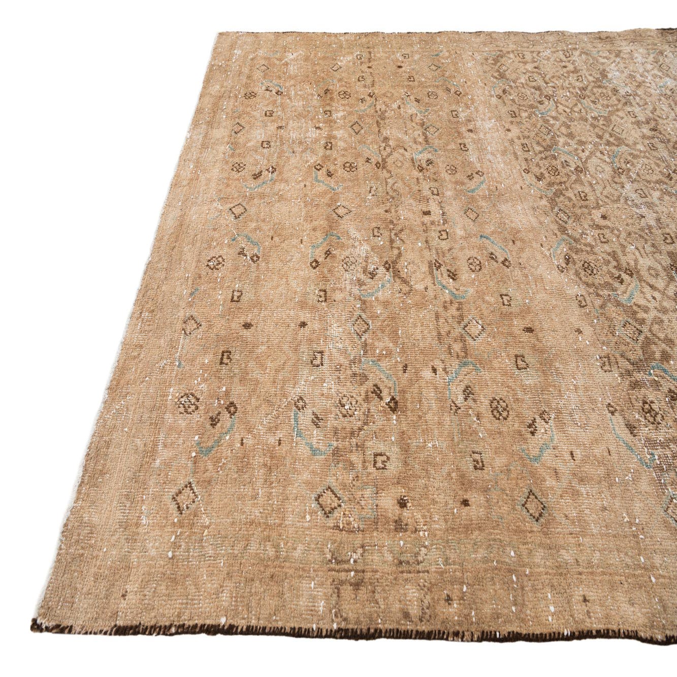 A 6x9 rectangular brown and tan Persian-style wool rug with a distressed vintage pattern and subtle blue accents.