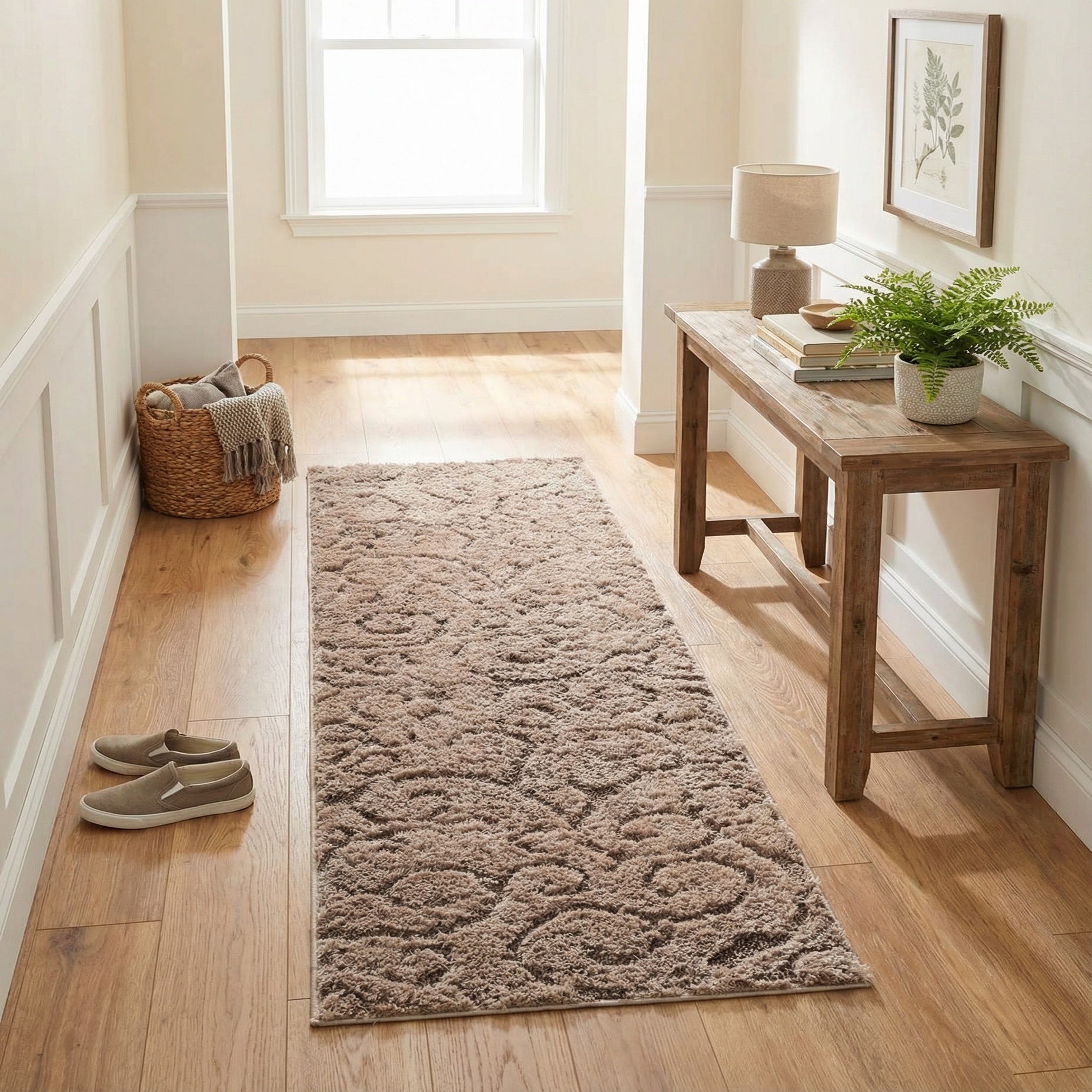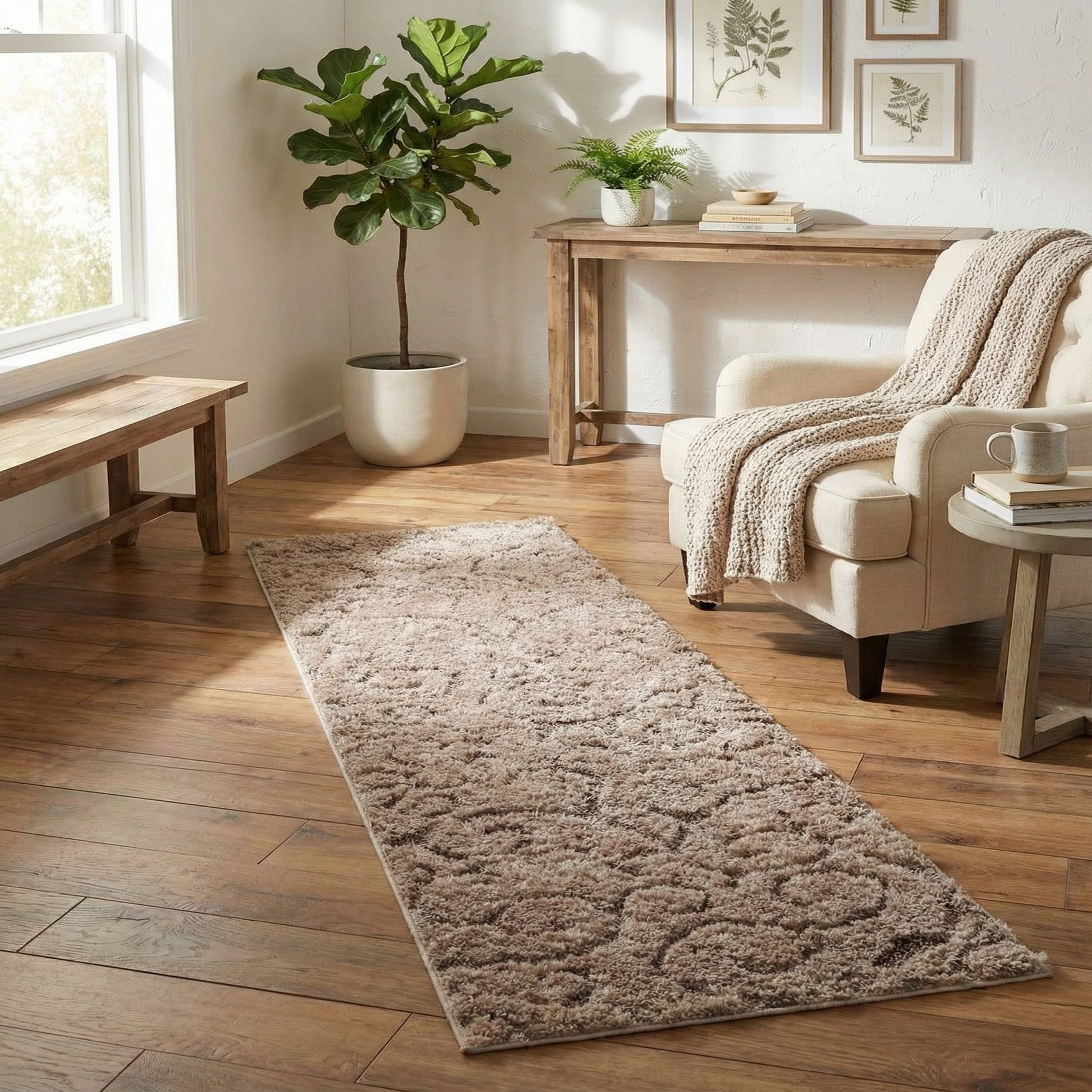 This runner works well in narrow spaces where comfort and style matter — think entryways, hallways, or beside the bed. It complements warm wood floors, cream or beige upholstery, and transitional or modern farmhouse interiors; it also layers nicely with natural textiles like linen or woven baskets. Use it to add tactile warmth in a long gallery or to soften the flow through a kitchen corridor without changing your existing color scheme.