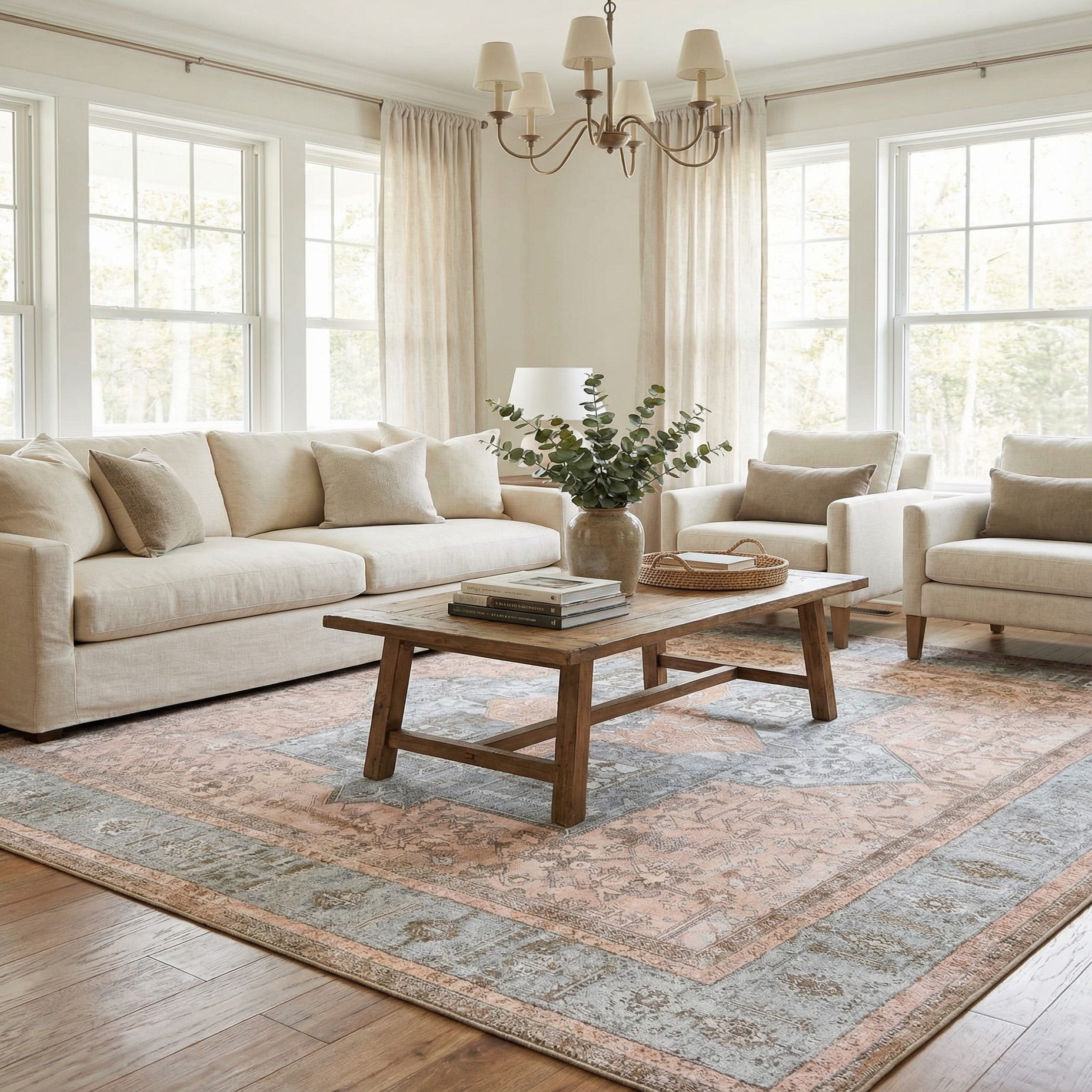 A 7' 6 x 7' 6 square flatweave rug featuring a faded medallion pattern in browns, tans, and light blue tones.