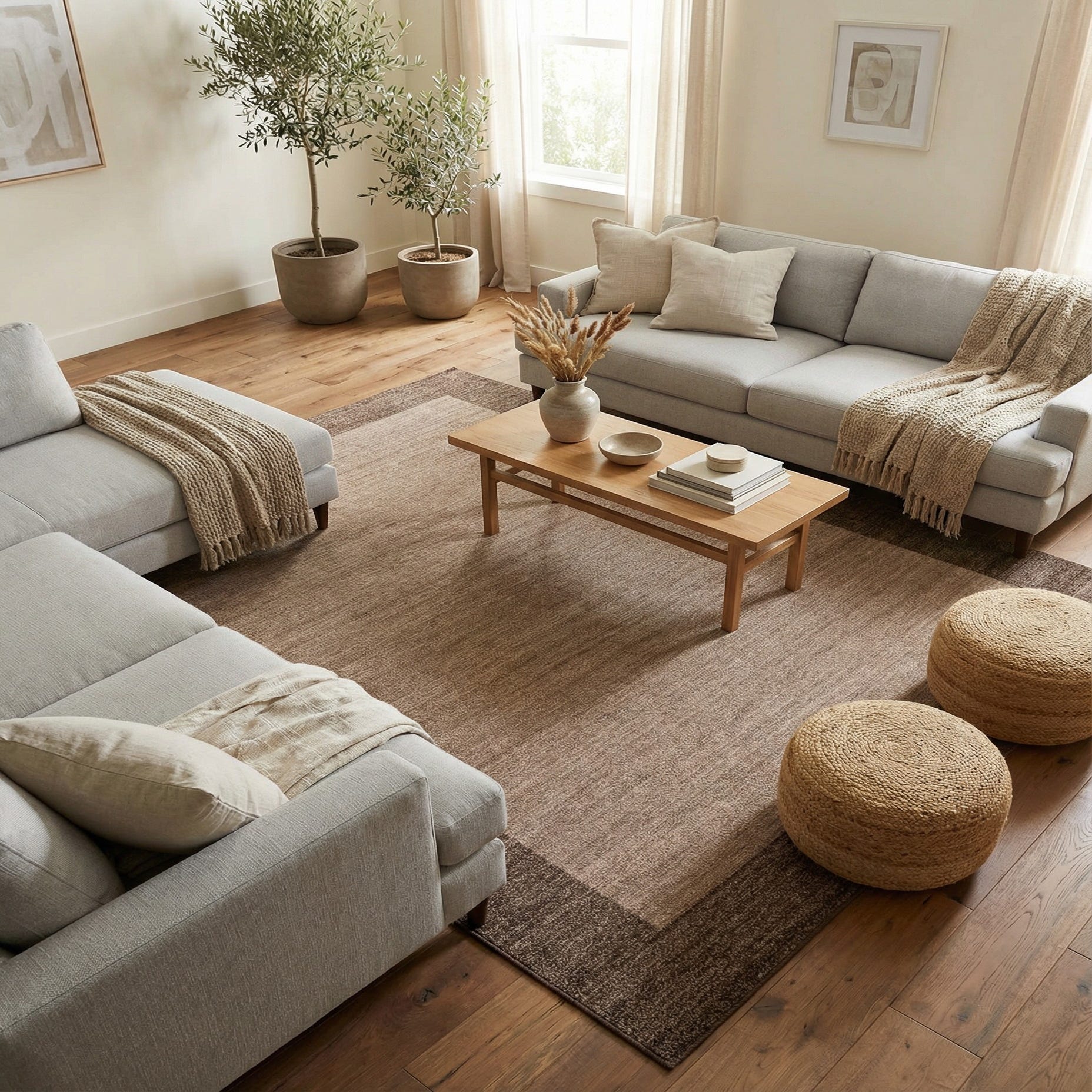 This piece works well as an anchor for a neutral living room, grounding a sofa and coffee table without competing with patterned upholstery. It also fits naturally beneath a dining table or in a home office, complementing warm wood tones, leather seating, and cream or taupe textiles. The muted light brown, beige, and brown palette makes it easy to layer with textured throws and natural accents for a relaxed, cohesive interior.