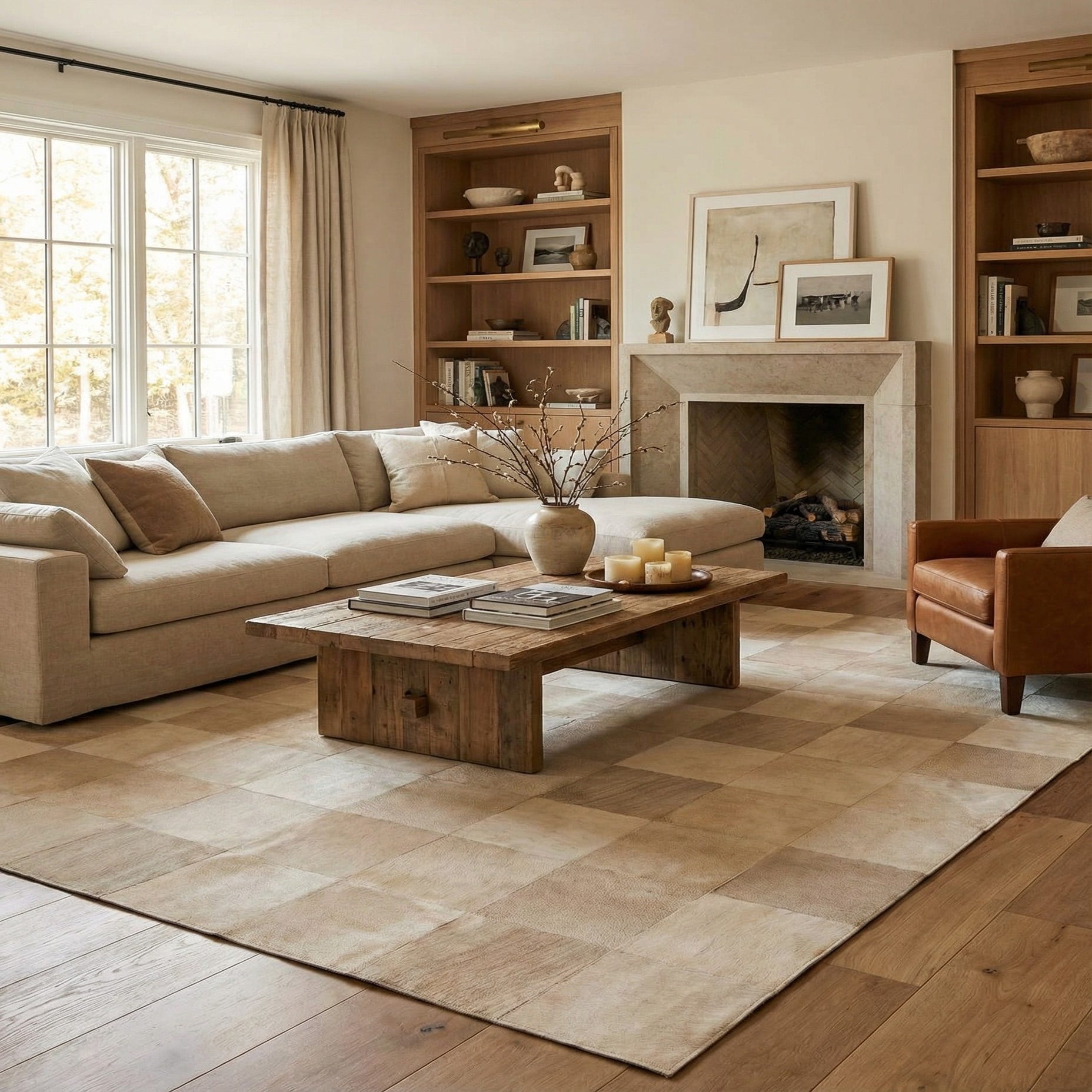 Hand made of cowhide and leather, this rug presents a clean, geometric patchwork of square panels in soft light brown and beige tones. The background is light brown, while each square shows subtle shifts in shade and grain that create a quiet checkerboard effect. Running your hand across it, you feel a low, velvety surface with gentle variations where the leather patches meet—natural texture without heavy pile, offering a smooth, tactile presence underfoot.