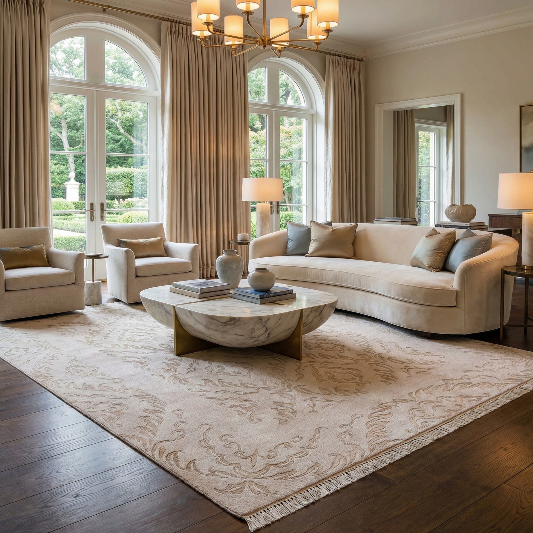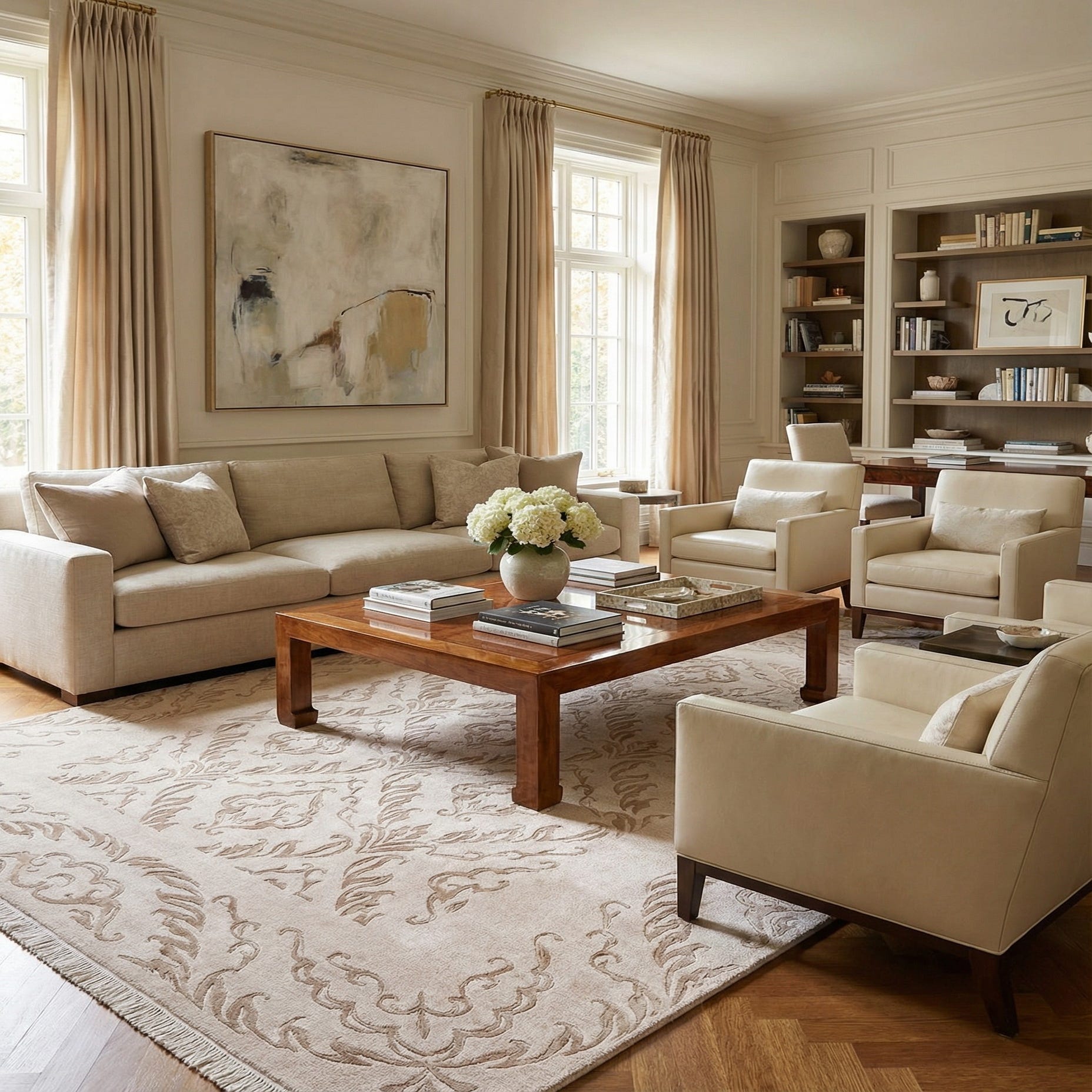 This piece suits a range of interiors: place it beneath a seating group to ground a living room in warm neutrals, layer it under a bed to soften a bedroom scheme, or position it in an entry or formal dining area to introduce quiet pattern without overwhelming the space. It pairs well with warm woods, leather, and muted metallic accents and complements transitional, traditional, and modern classic decor.
