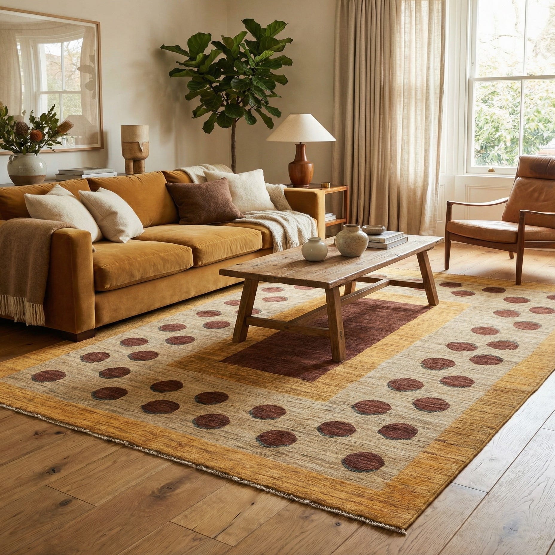 The rug's texture and hand-knotted construction speak of its quality and craftsmanship, making it ideal for high-traffic areas and a long-lasting addition to any living space. Its natural wool composition ensures depth and warmth, ideal for creating a cozy ambiance.