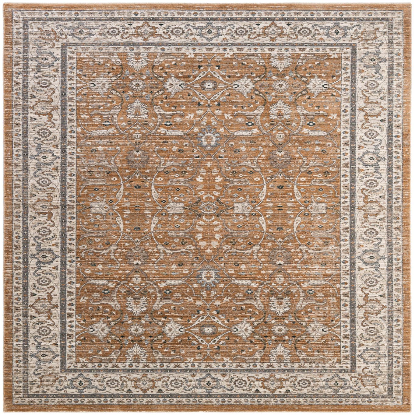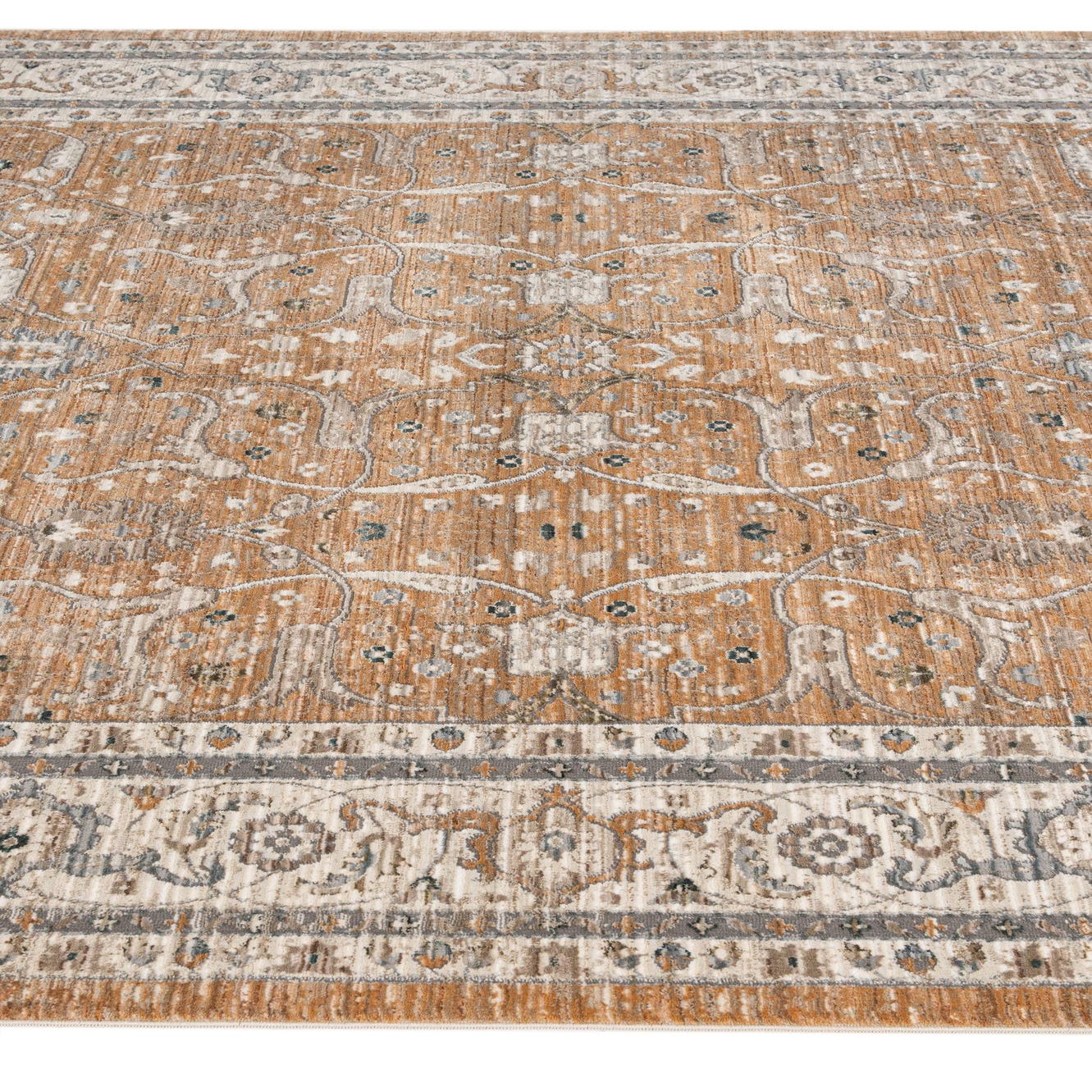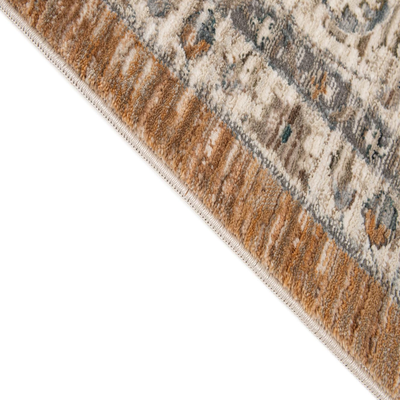 Primary color is Light Brown. Colors in this rug include: Light Brown, Blue, Ivory, Gray.