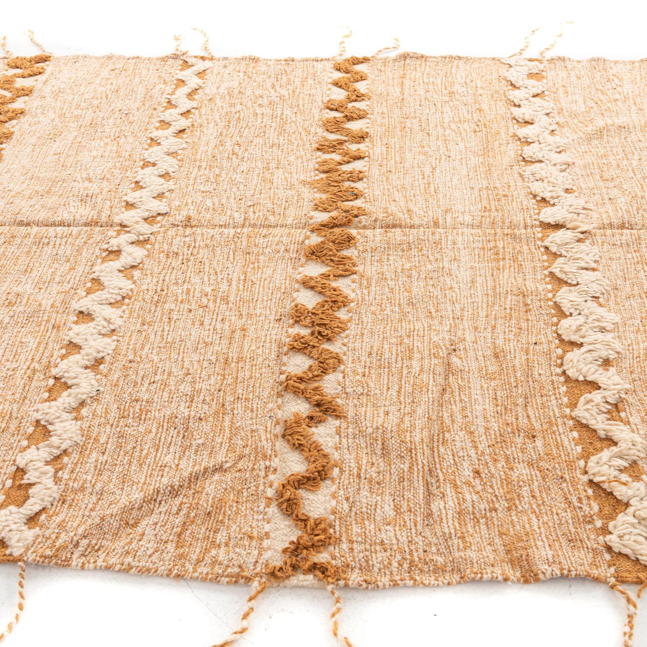 The texture of the rug is substantial, indicative of its hand-knotted construction, which adds depth and a tactile quality to the piece. The fringe detailing contributes an additional element of traditional craftsmanship, enhancing its authentic Moroccan appeal.