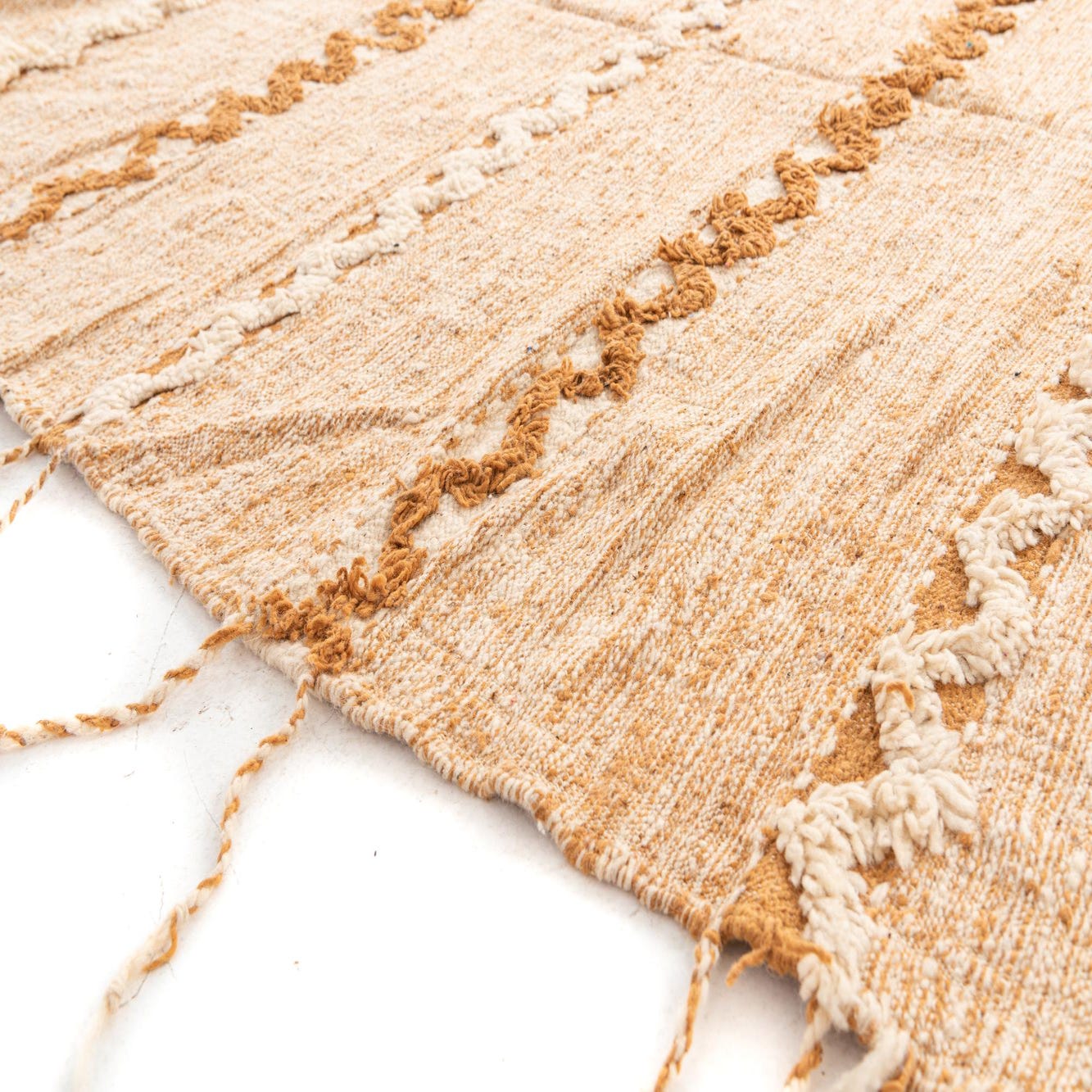 This Moroccan collection rug is hand knotted of 100% wool, offering a luxurious and warm foundation for your living space. The size of this piece is a substantial 7x10, making it a versatile choice for a variety of room settings. The rug features a light brown background, accented with ivory patterns that provide a subtle yet distinct contrast. The design displays organic, undulating lines that give it a natural and relaxed aesthetic.