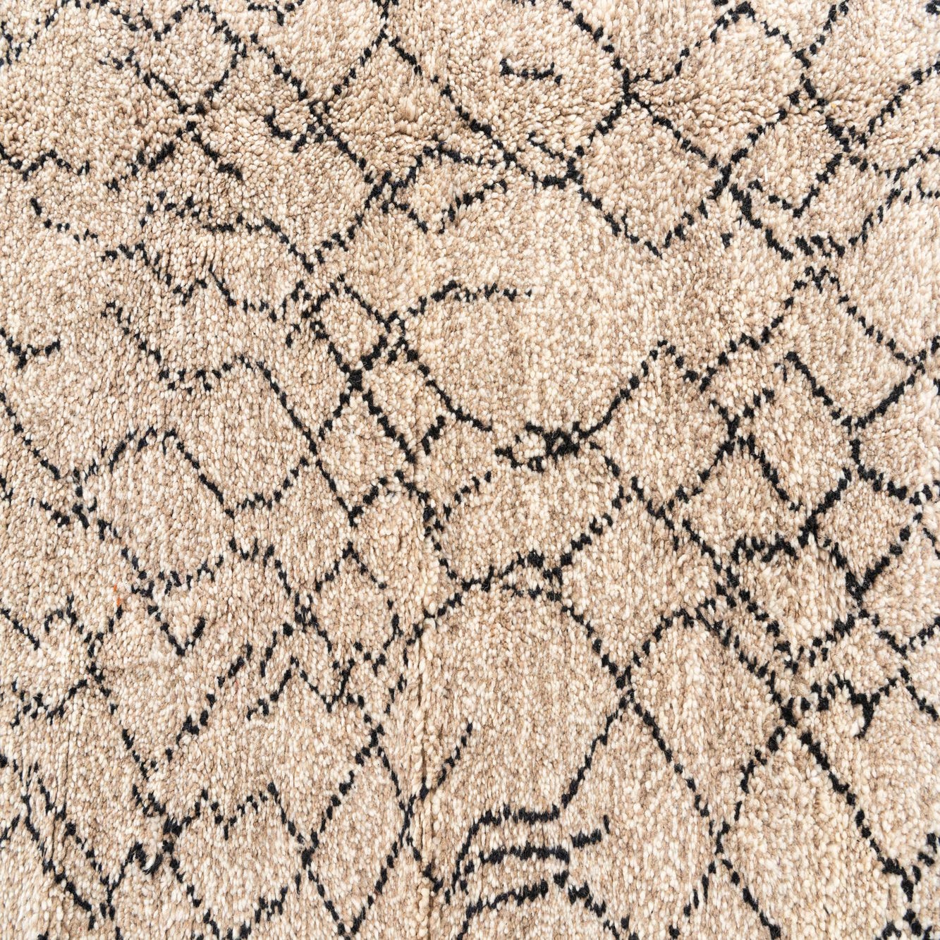 A 7x10 rectangular Moroccan shag rug in tan with a black abstract tribal pattern and fringed ends.