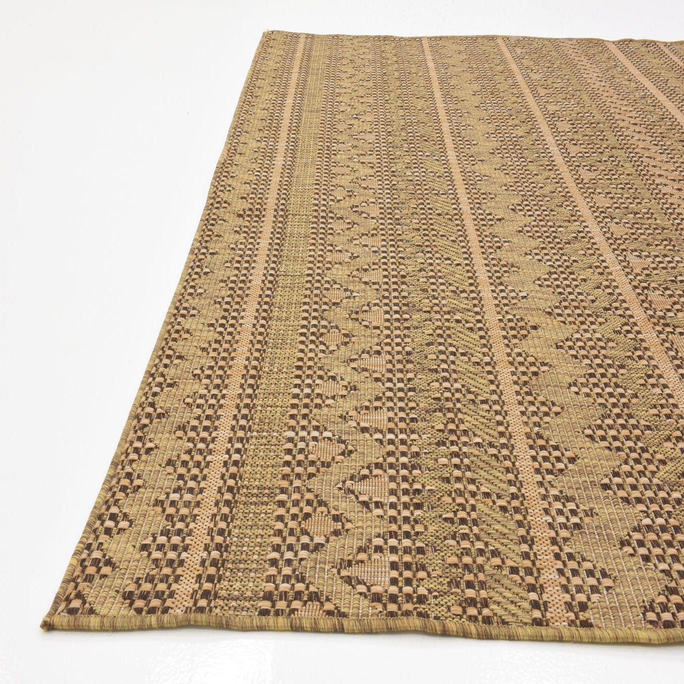 This rug would fit seamlessly into a variety of decor scenarios, from contemporary patios and modern deck areas to transitional spaces that blur the lines between indoor and outdoor living. Its resilient material and versatile appearance make it suitable for integrating into sunrooms, dining areas, or covered terraces, and its color palette complements natural elements like wood and stone, as well as outdoor furniture in neutral or metallic tones.