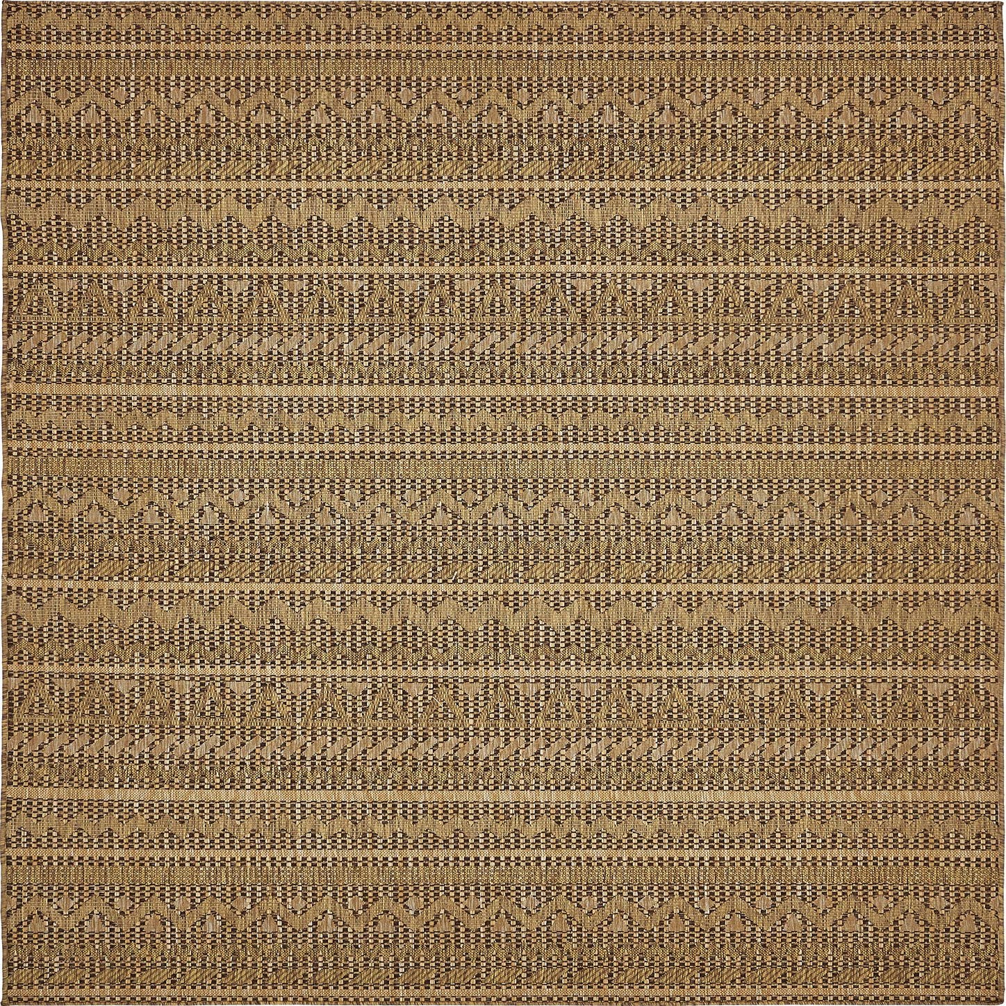 This rug would fit seamlessly into a variety of decor scenarios, from contemporary patios and modern deck areas to transitional spaces that blur the lines between indoor and outdoor living. Its resilient material and versatile appearance make it suitable for integrating into sunrooms, dining areas, or covered terraces, and its color palette complements natural elements like wood and stone, as well as outdoor furniture in neutral or metallic tones.