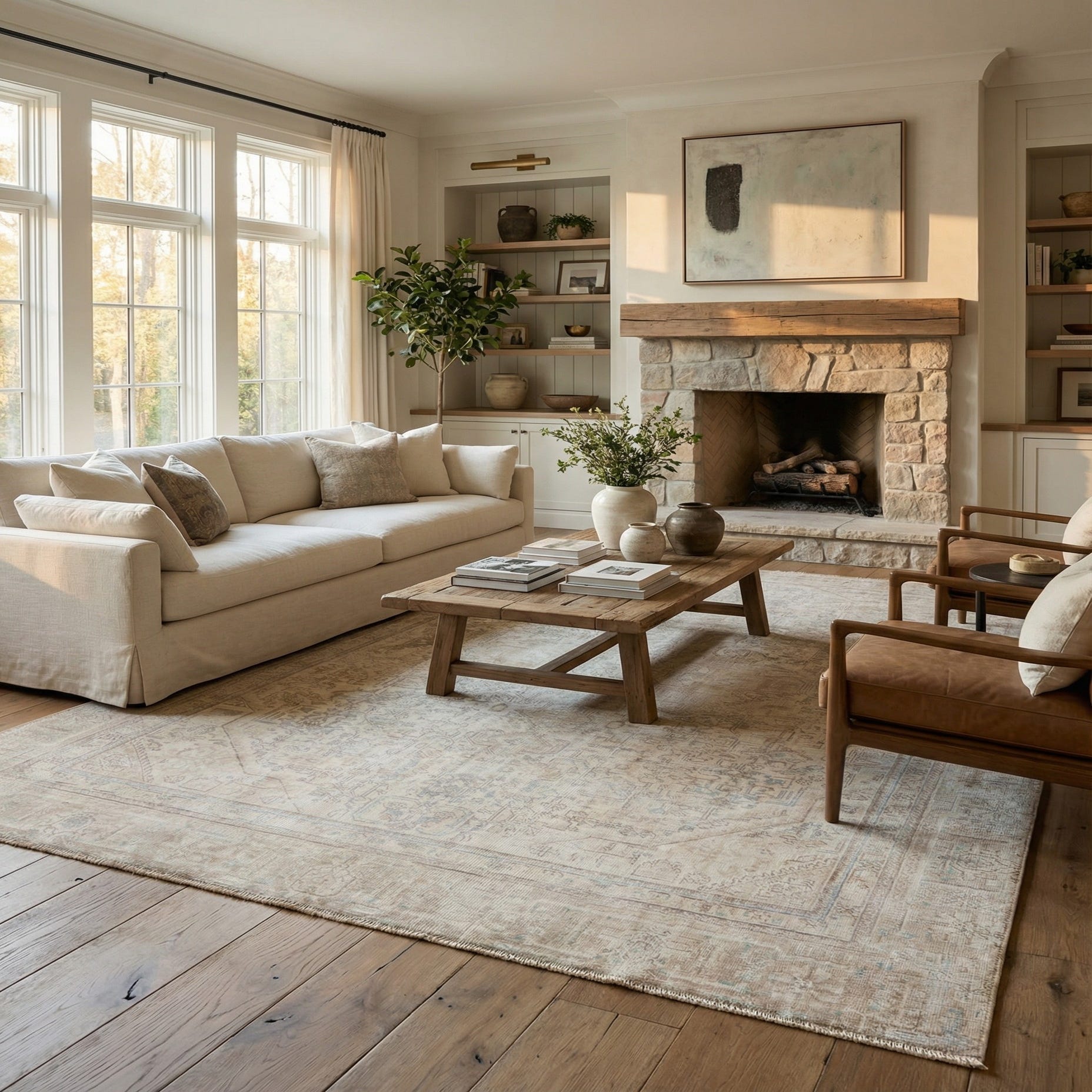 Primary color is Light Brown. Colors in this rug include: Light Brown, Brown, Ivory, Blue.