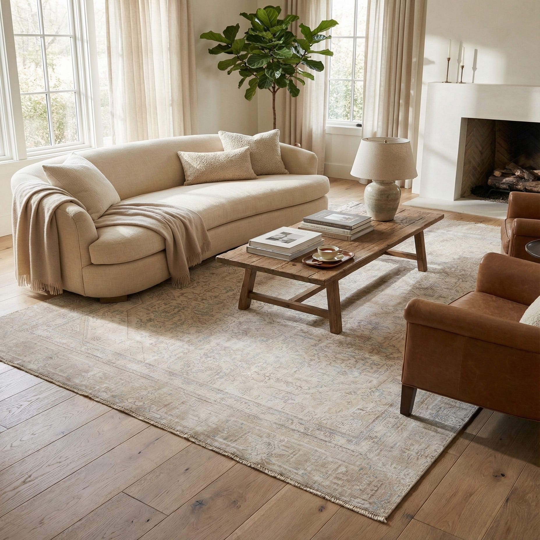 The Ultra Vintage Collection hand-knotted rug measures 7x10 and presents a blend of light brown, brown, ivory, and blue hues on a light brown backdrop. It features a traditional design with a delicate patina that adds depth and character to its intricate pattern. The rug's texture is rich and inviting, thanks to its 100% wool construction, which also ensures durability.