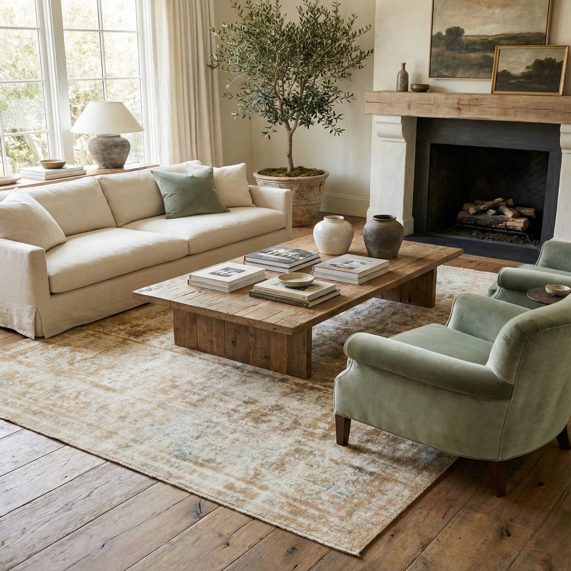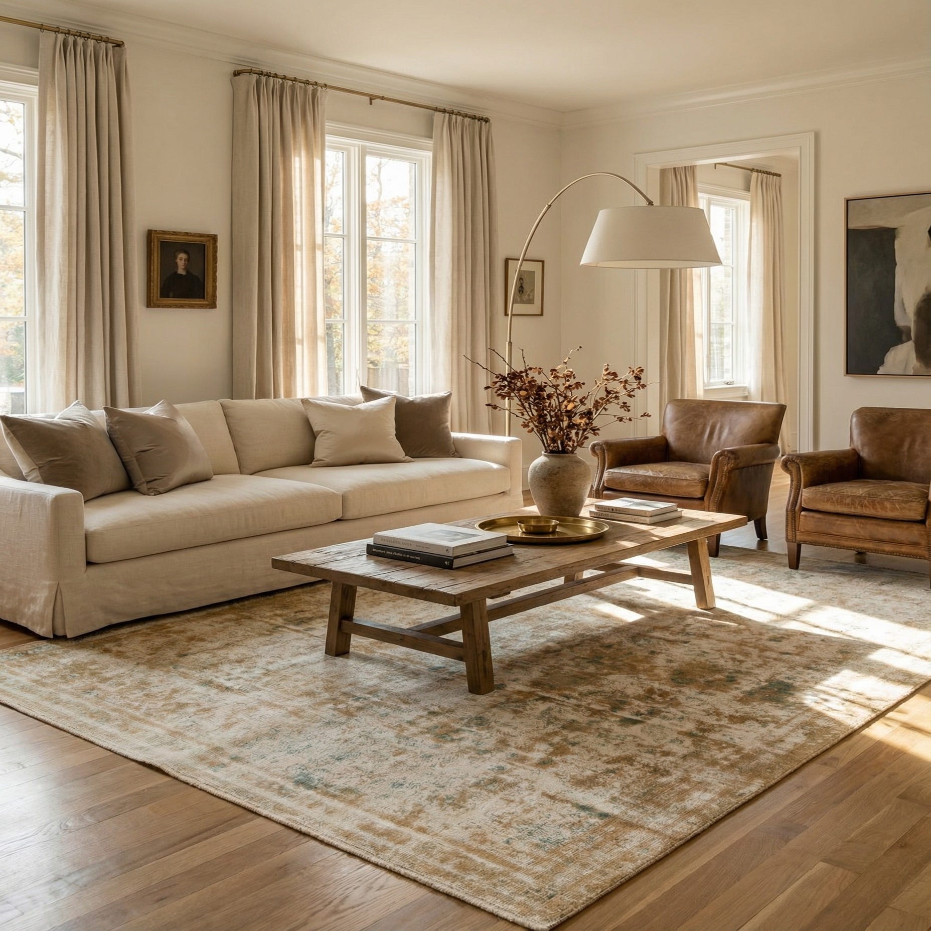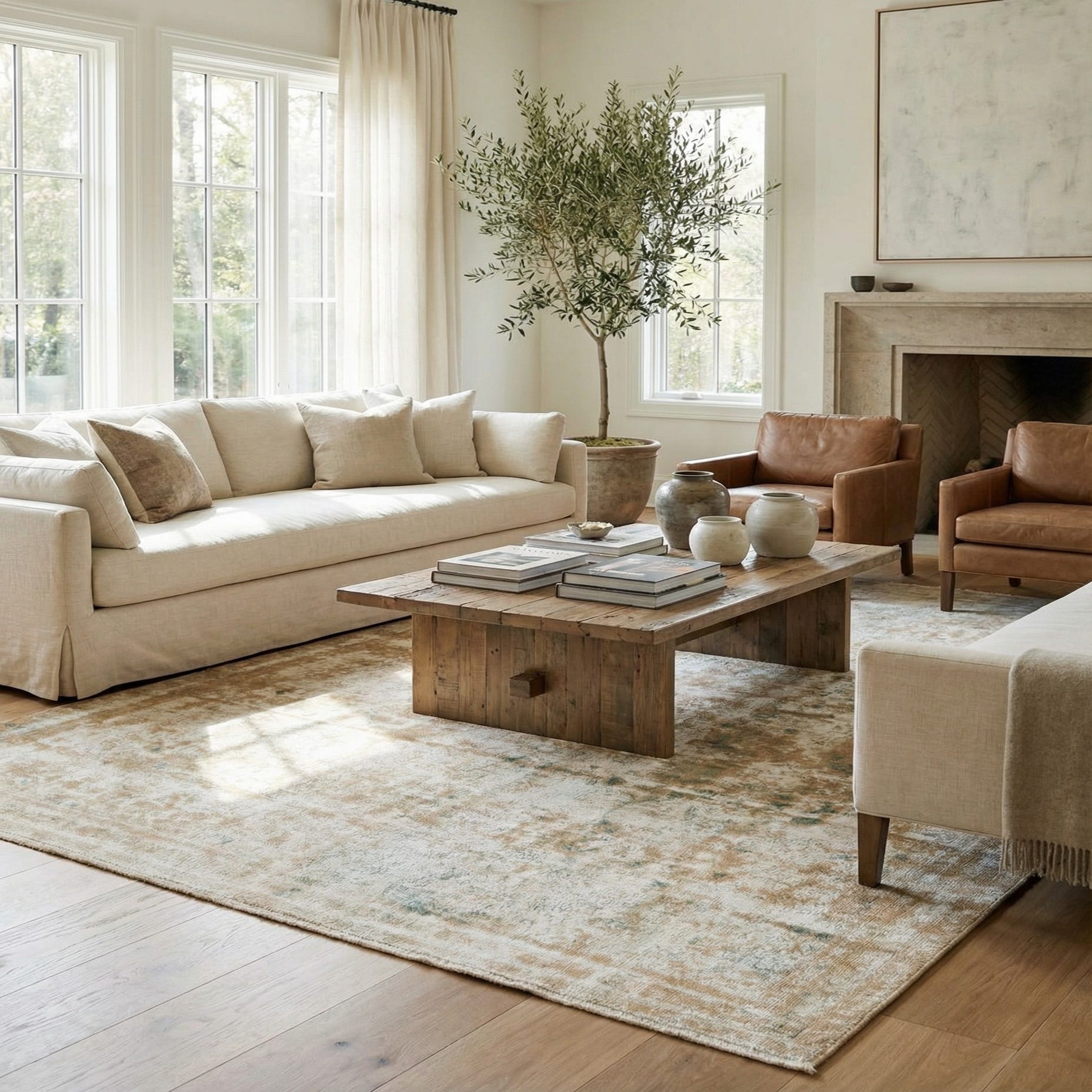 The Ultra Vintage Collection offers a timeless centerpiece with its hand-knotted 7x10 rug crafted from 100% wool, combining durability and a plush feel. This rug displays a light brown background, complemented by subtle patterns in ivory and touches of green, creating an elegant yet understated visual appeal. The design features a faded, distressed look, drawing from a rich heritage aesthetic while maintaining a modern sensibility.