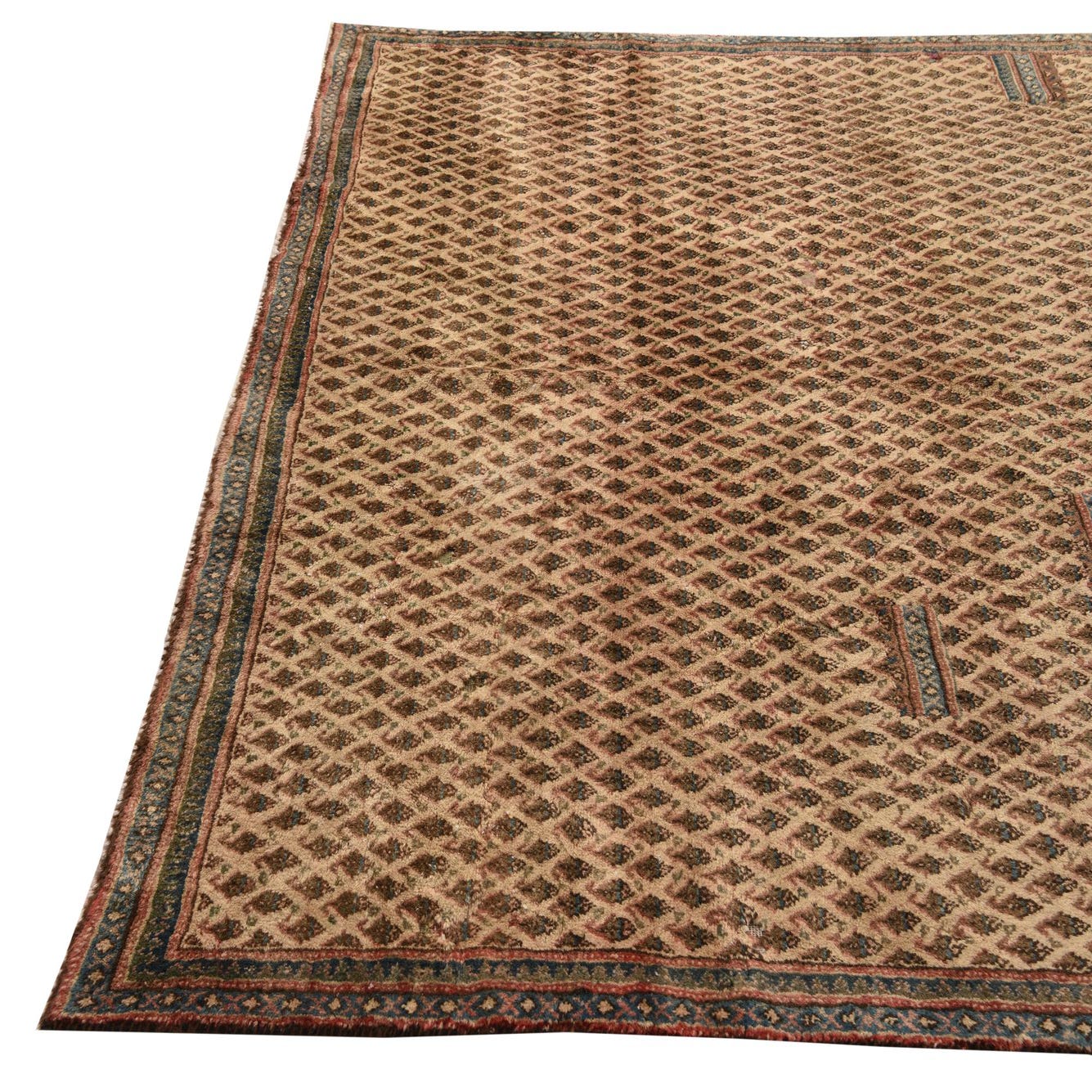 A 7x10 rectangular Ultra Vintage wool rug in shades of brown and tan, featuring a detailed Persian-style diamond pattern with a thin blue border.