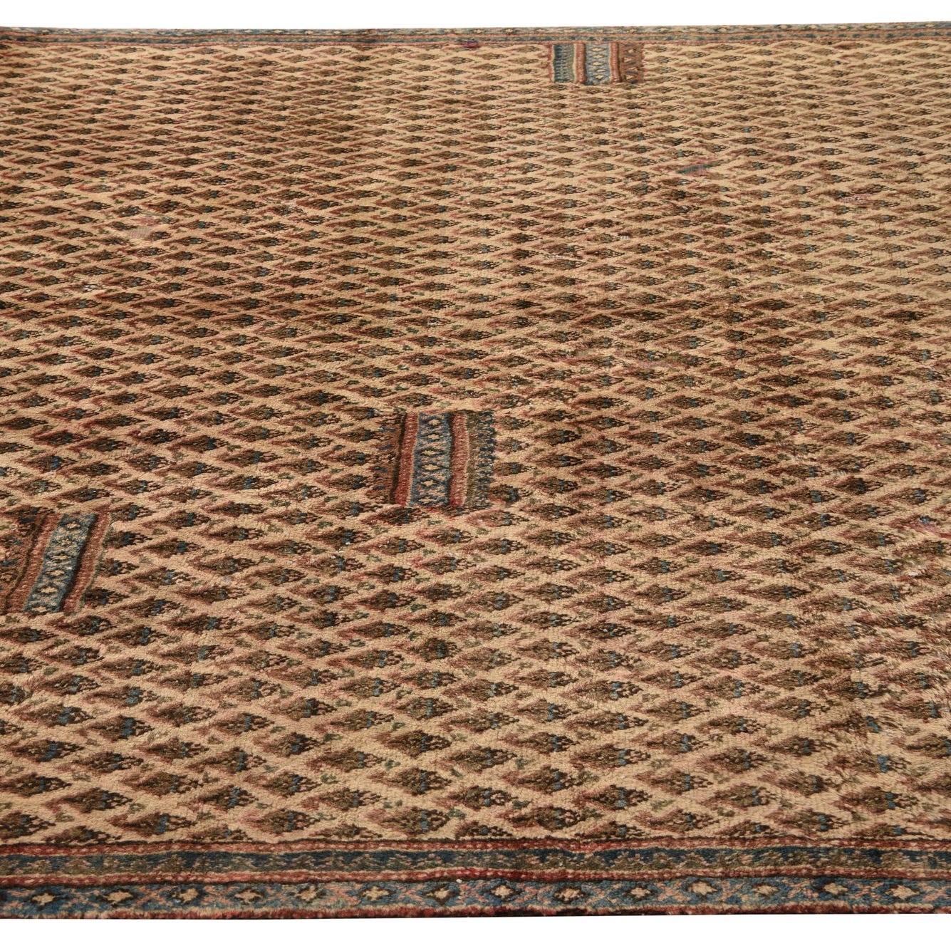 Primary color is Light Brown. Colors in this rug include: Light Brown, Brown, Navy Blue, Rust Red.