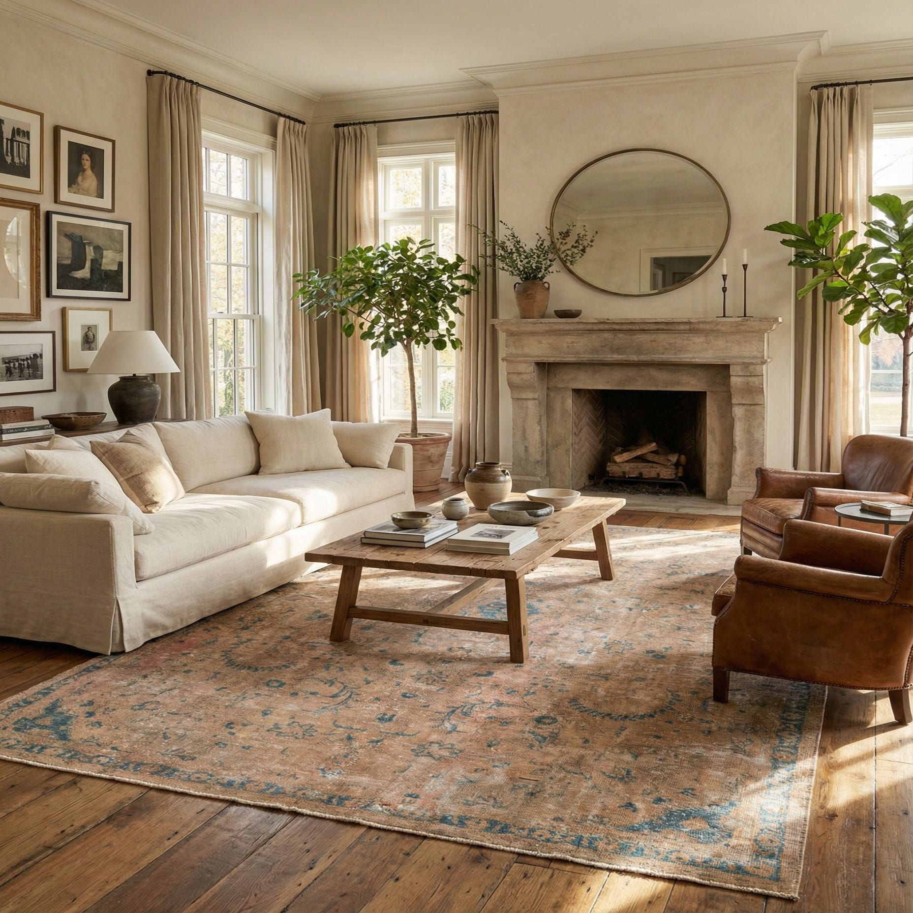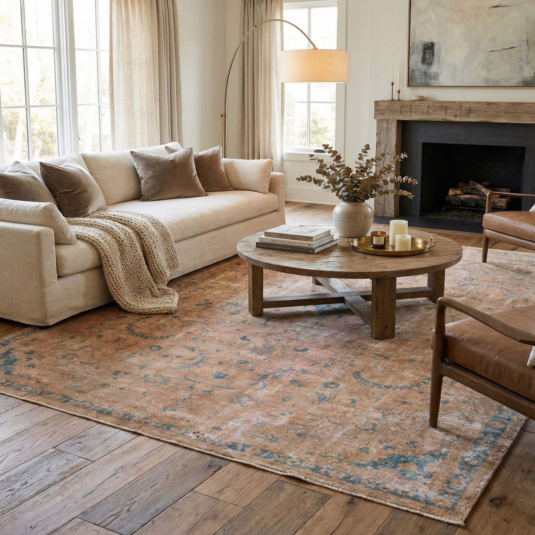 This rug would seamlessly integrate into a variety of interior design schemes. Its subdued yet rich colors make it well-suited for spaces that aim for a classic or vintage-inspired feel, such as a study, living room, or dining area with antique furnishings or wood accents. The rug's timeless design also affords it the flexibility to complement modern, minimalist settings where it can serve as an eye-catching centerpiece without overpowering the room's aesthetic.