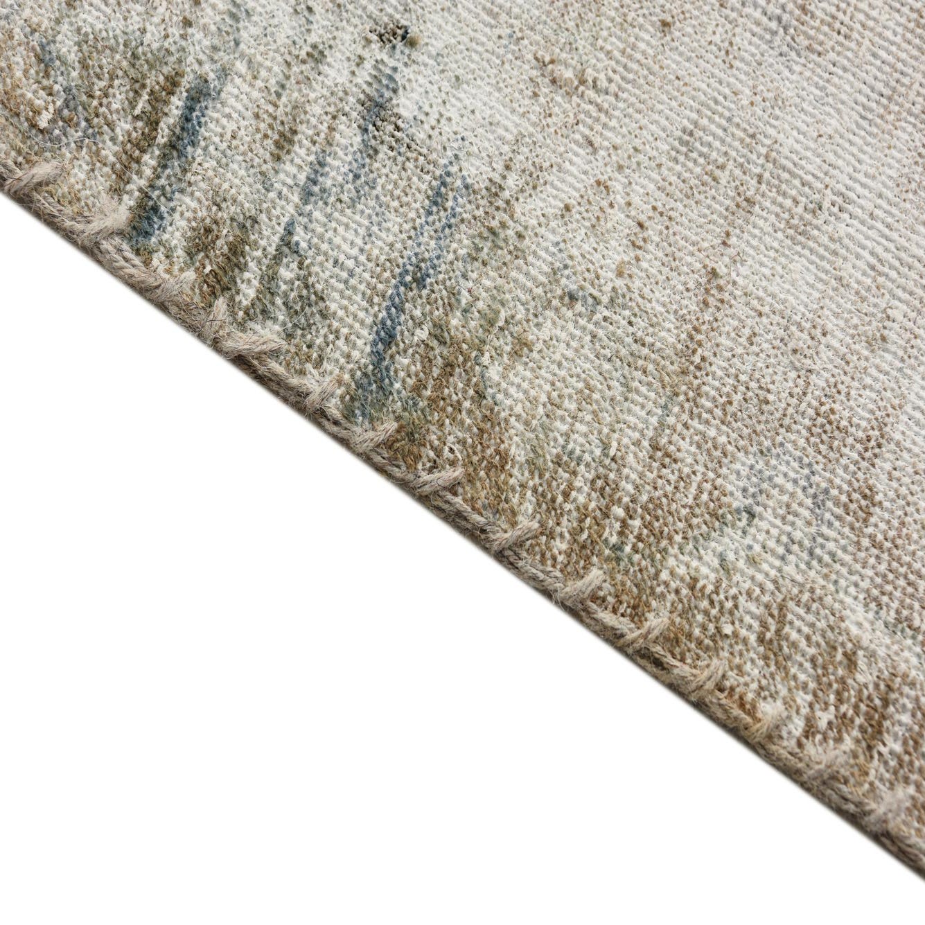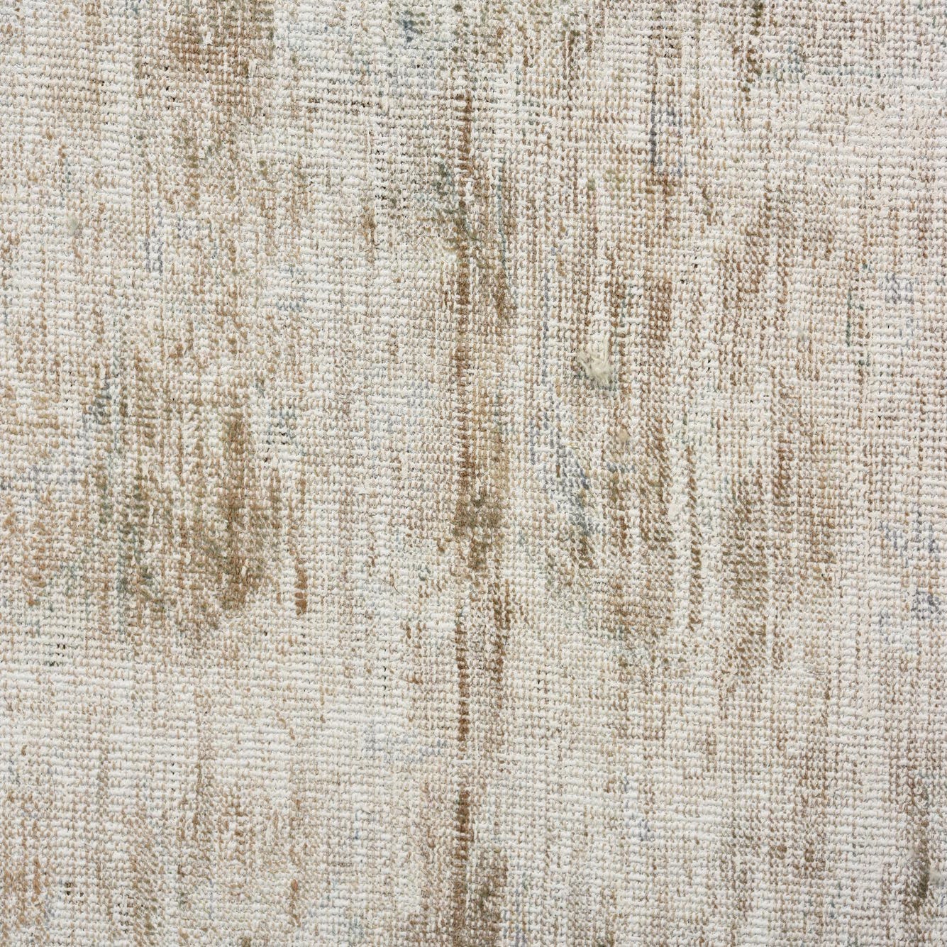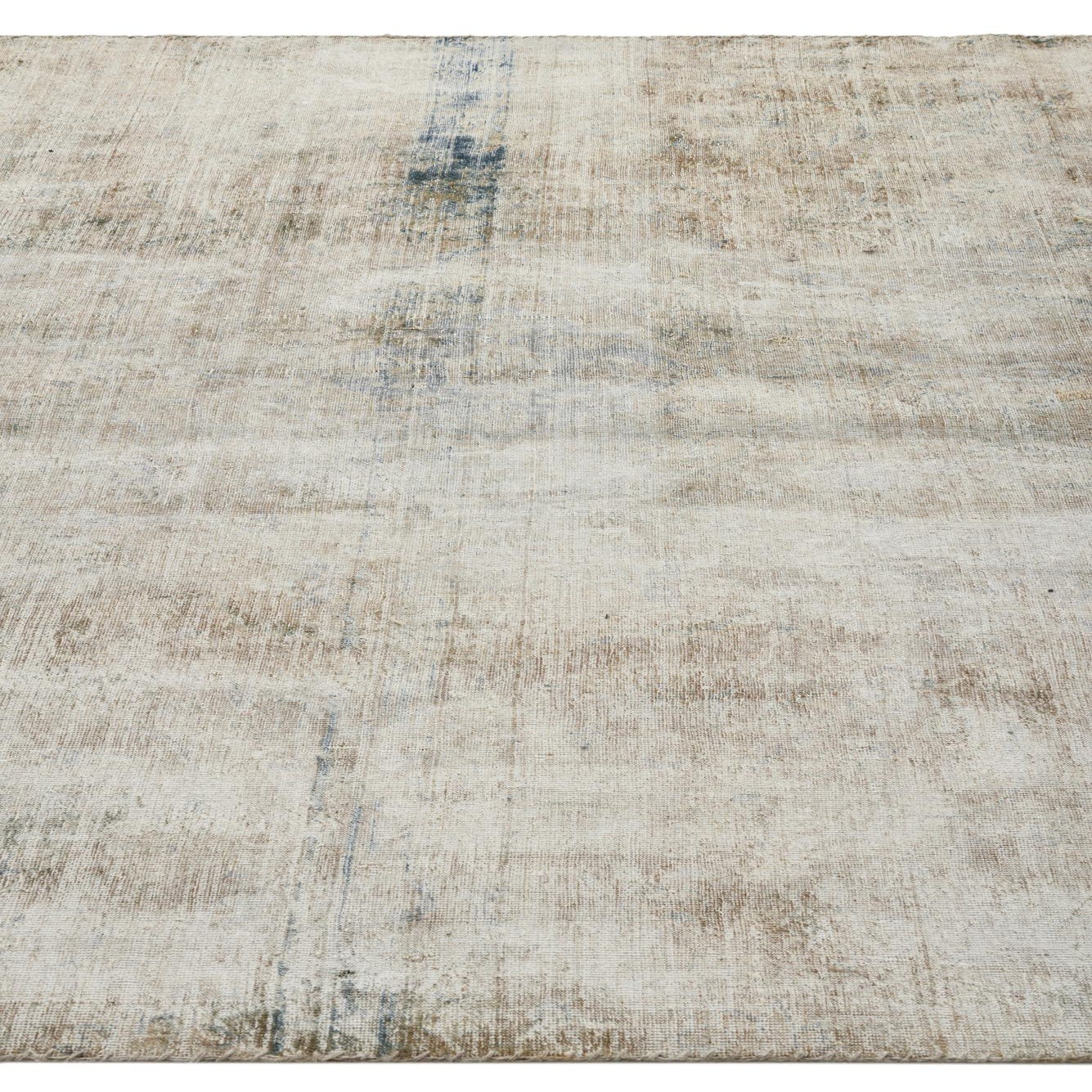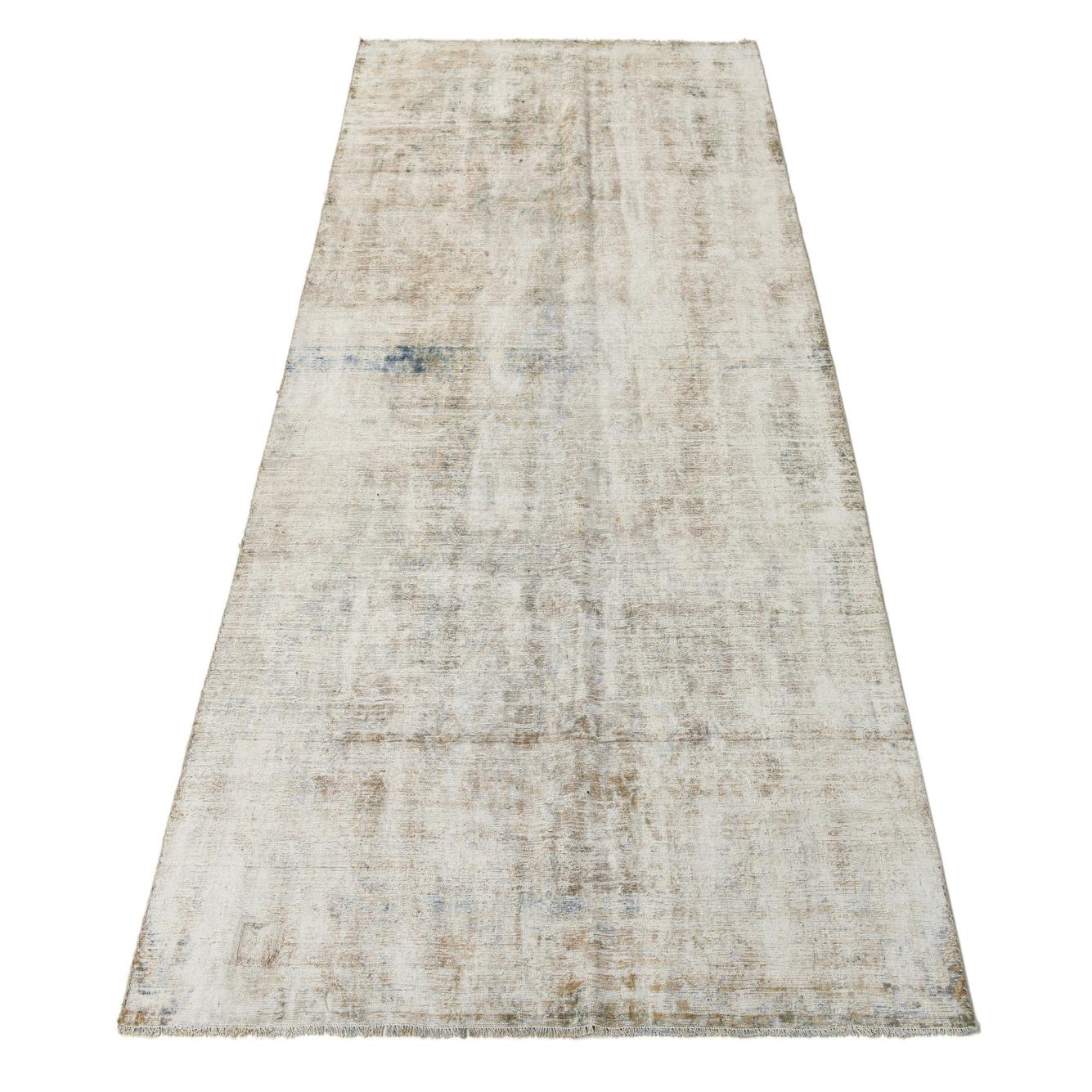 The rug's texture is indicative of its hand-knotted construction, promising a durable and plush underfoot experience. The inclusion of fringe on either end adds a classic decorative touch, further embracing the vintage aesthetic. Due to its neutral and adaptable color palette, this rug is well-suited for a variety of interior design scenarios, including modern farmhouse, shabby chic, eclectic, and even contemporary spaces where a hint of vintage warmth is desired.