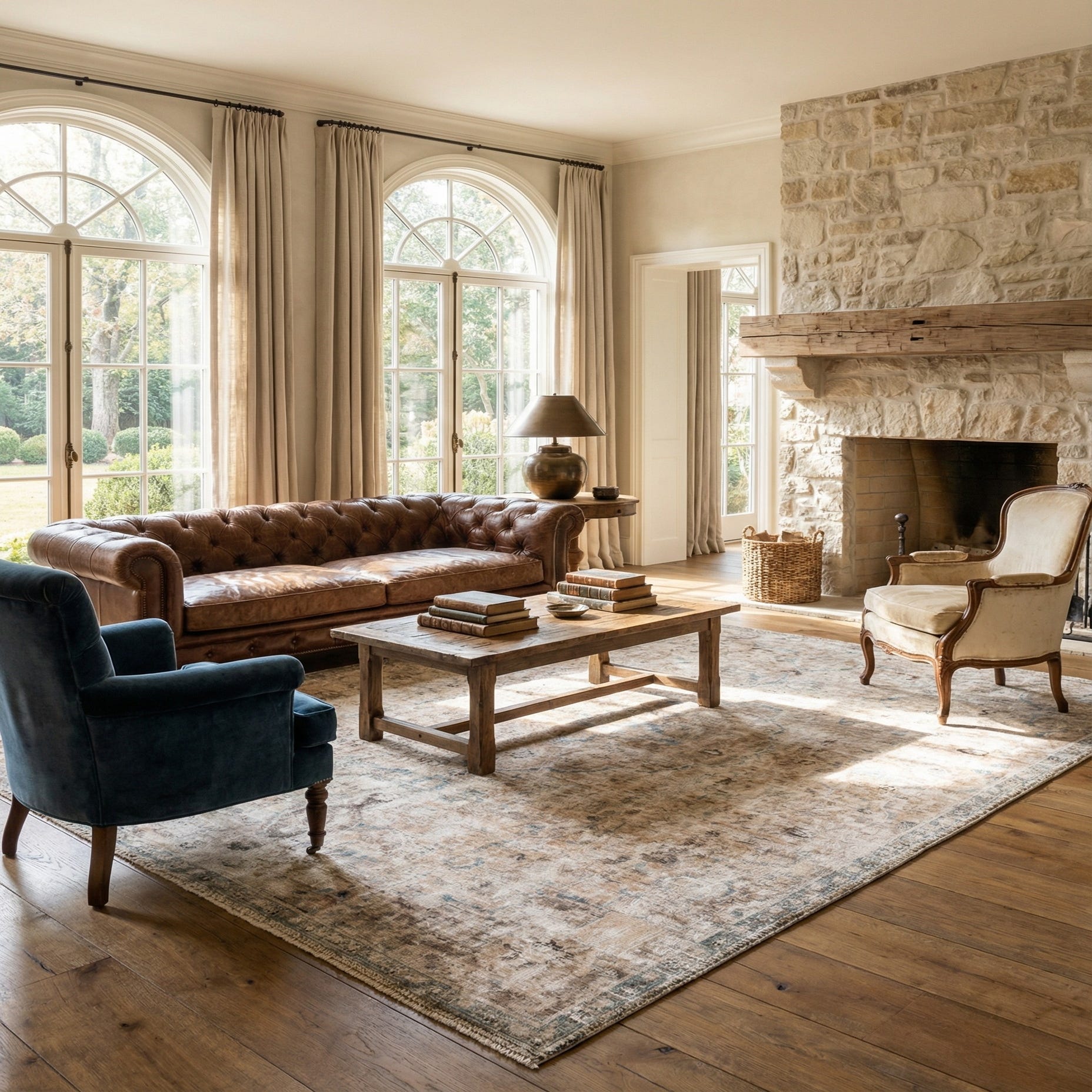 This piece works well as an anchor for a relaxed living room—place it under a seating group to soften hardwood floors and tie together neutral upholstery. It pairs naturally with warm wood tones, linen or leather sofas, and navy or ivory accent textiles, and it complements transitional, modern-traditional, farmhouse, and coastal-inspired interiors. Use it under a dining table to ground the arrangement or layer it in a bedroom to introduce texture and understated pattern.