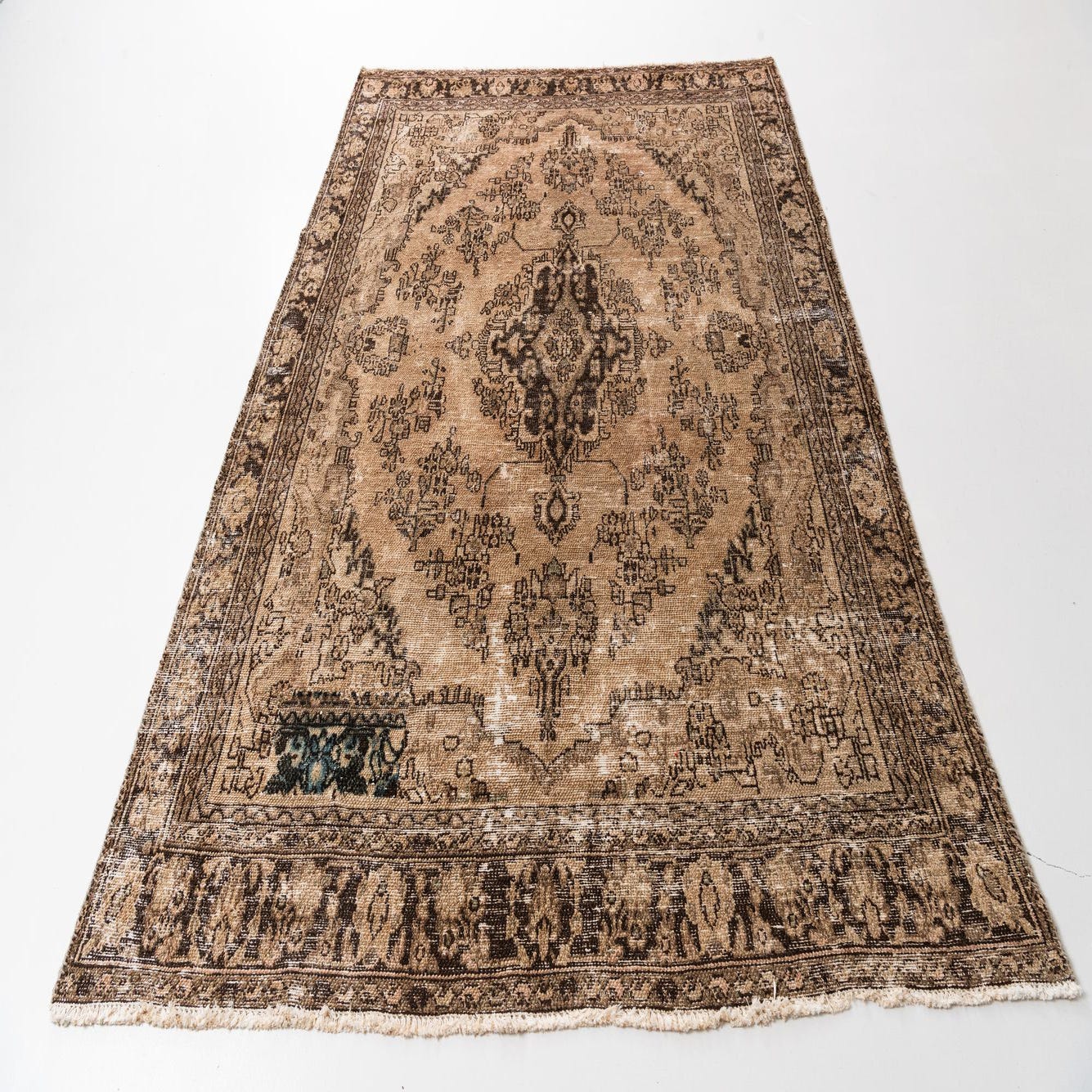 A 7x10 rectangular Ultra Vintage wool rug in browns and tans with a distressed Persian medallion pattern.