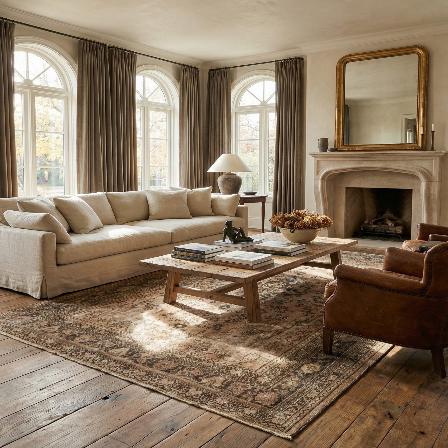The blend of light and darker tones makes it versatile for various decor scenarios. It would serve as a focal point in a living room with muted, neutral furniture, or complement a study with rich wooden finishes. This rug could also bridge the gap in an eclectic space, tying together antique pieces and modern accents with its enduring charm. Overall, its design is well-suited to environments that appreciate depth of history and hand-crafted quality.