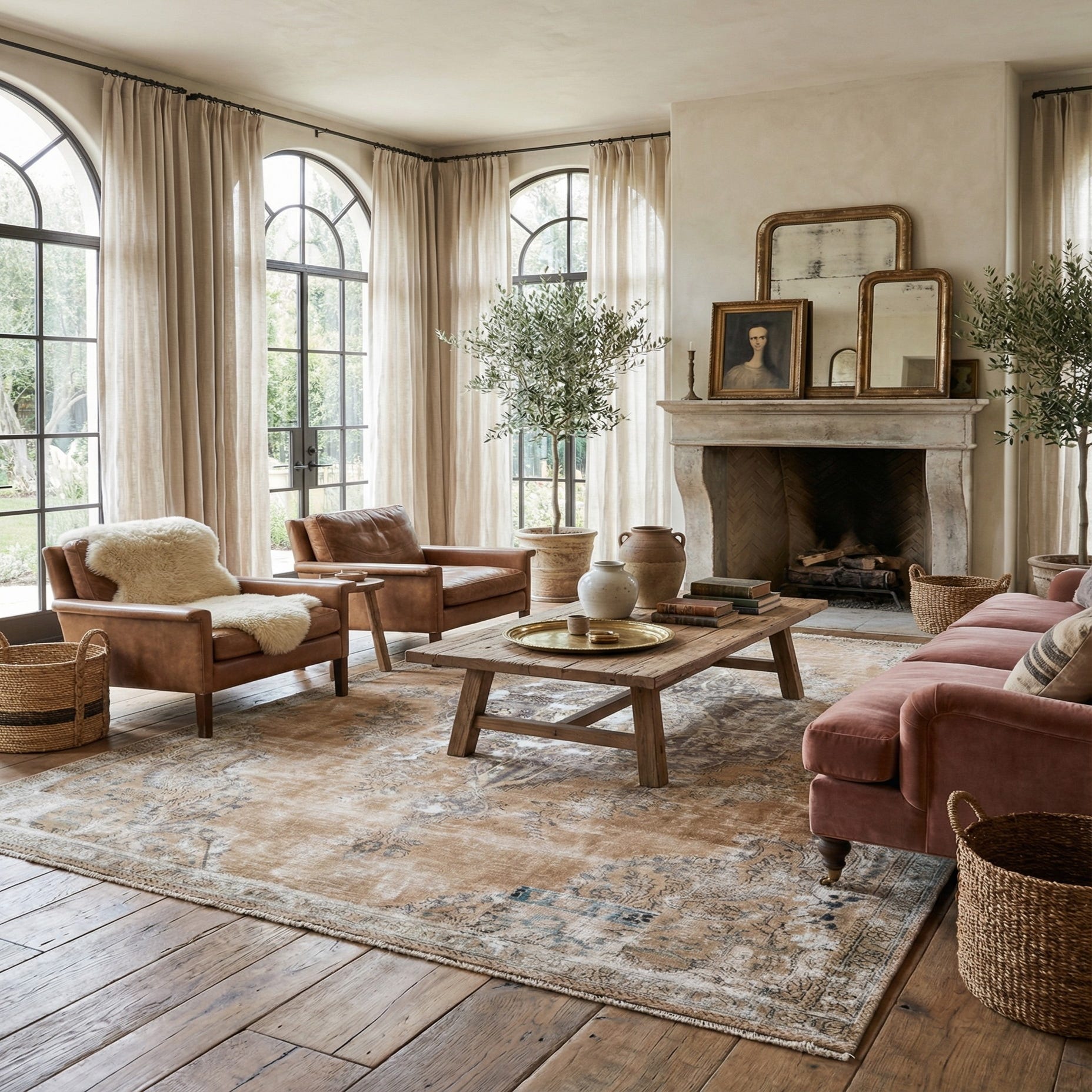 A 7x10 rectangular brown and tan wool rug with a distressed Persian medallion pattern, ideal for a living room.