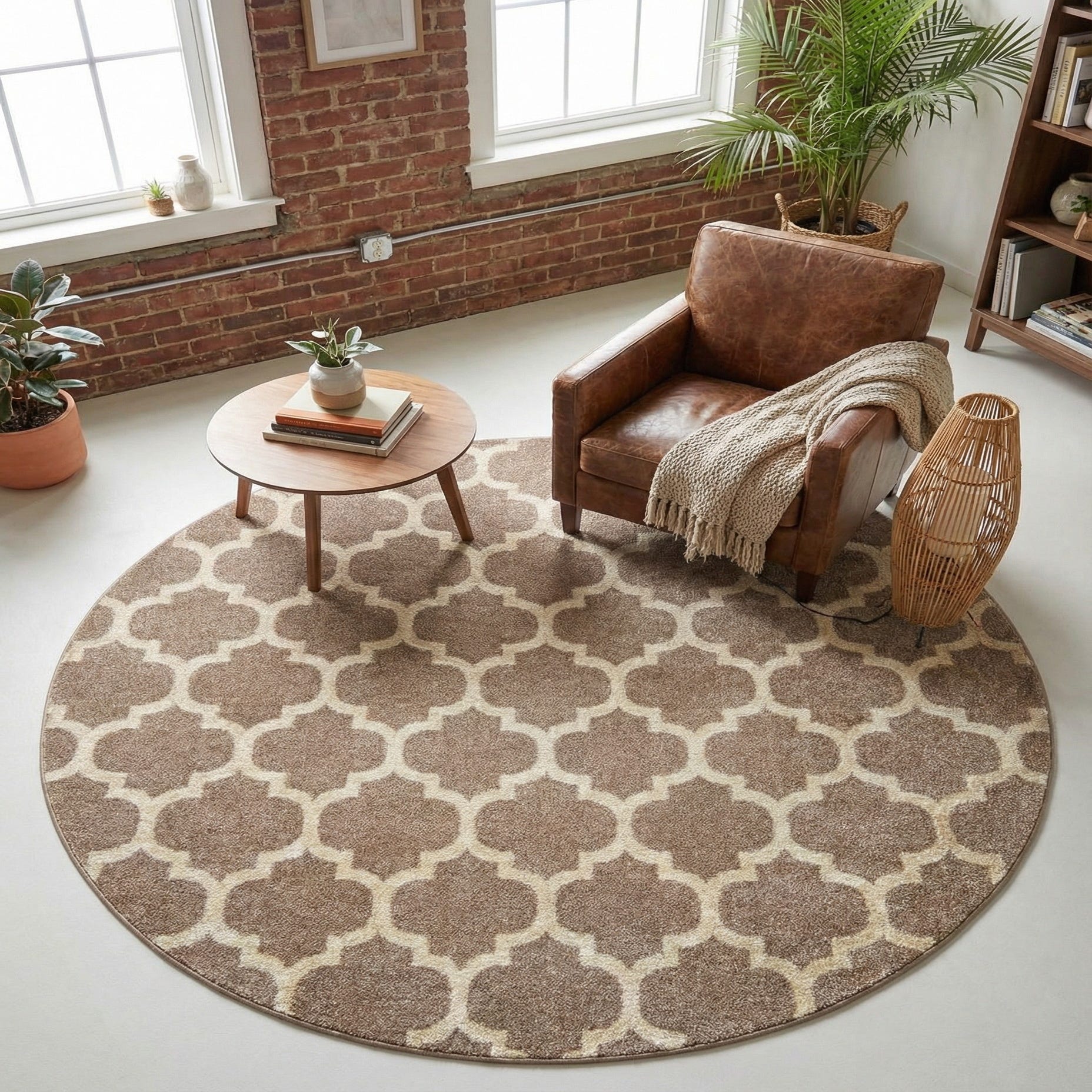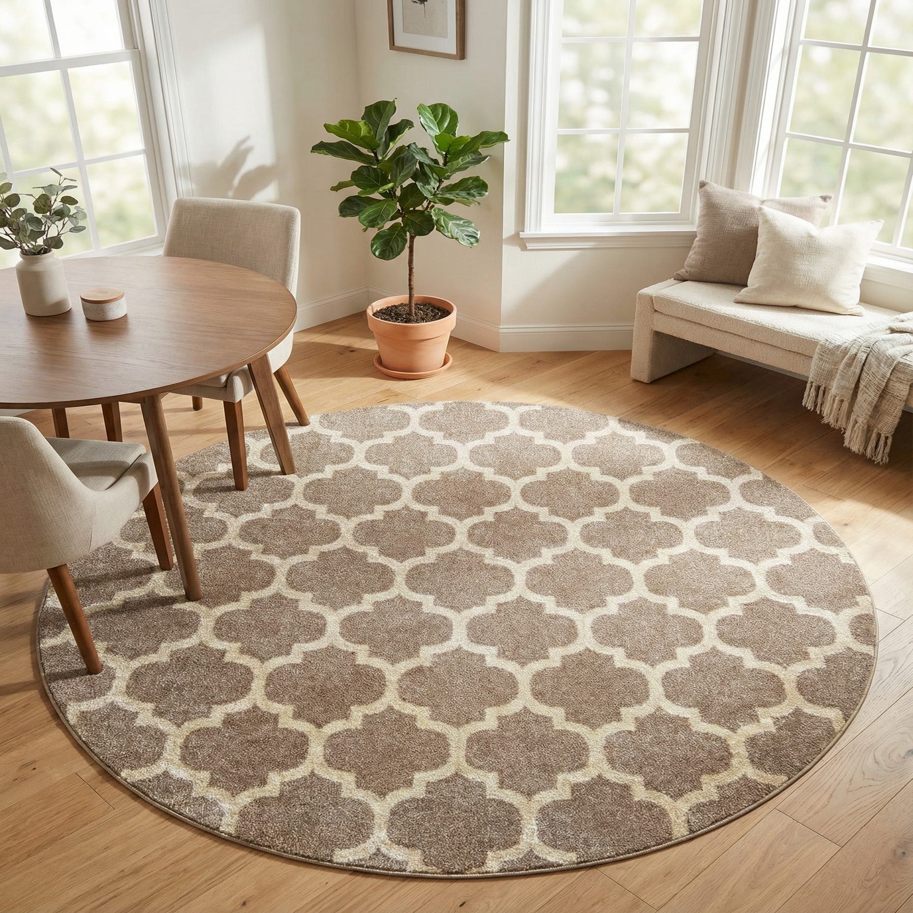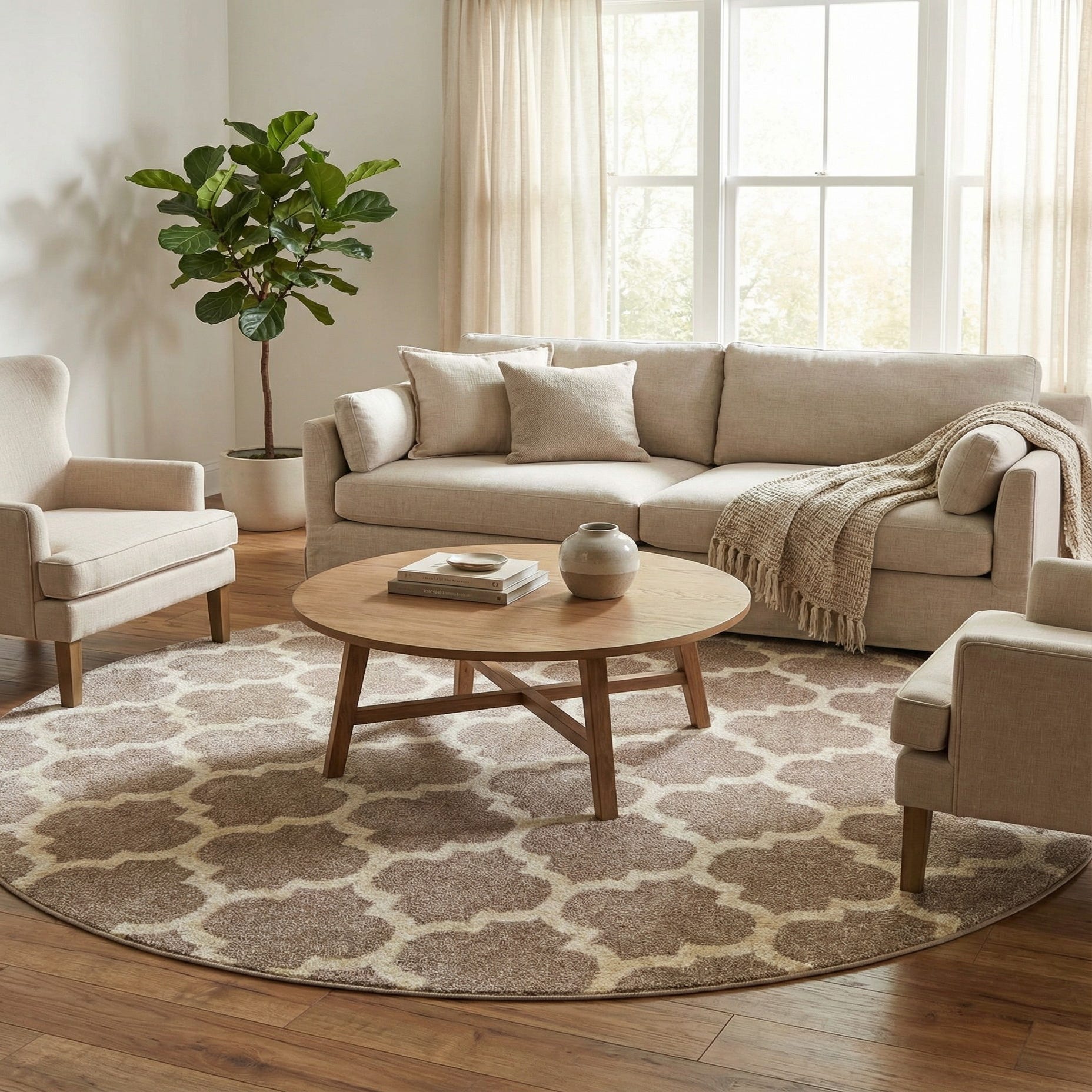 The Lattice Collection offers a round 8 Ft machine-woven rug, composed of 100% polypropylene, which ensures durability and a soft touch underfoot. This particular piece showcases a background color of light brown, tastefully complemented by a beige lattice pattern design. The structure of the rug imparts a visual texture that is pleasing to the eye, while the pattern presents a classic, geometric interlocking design, lending it a contemporary yet timeless appeal.