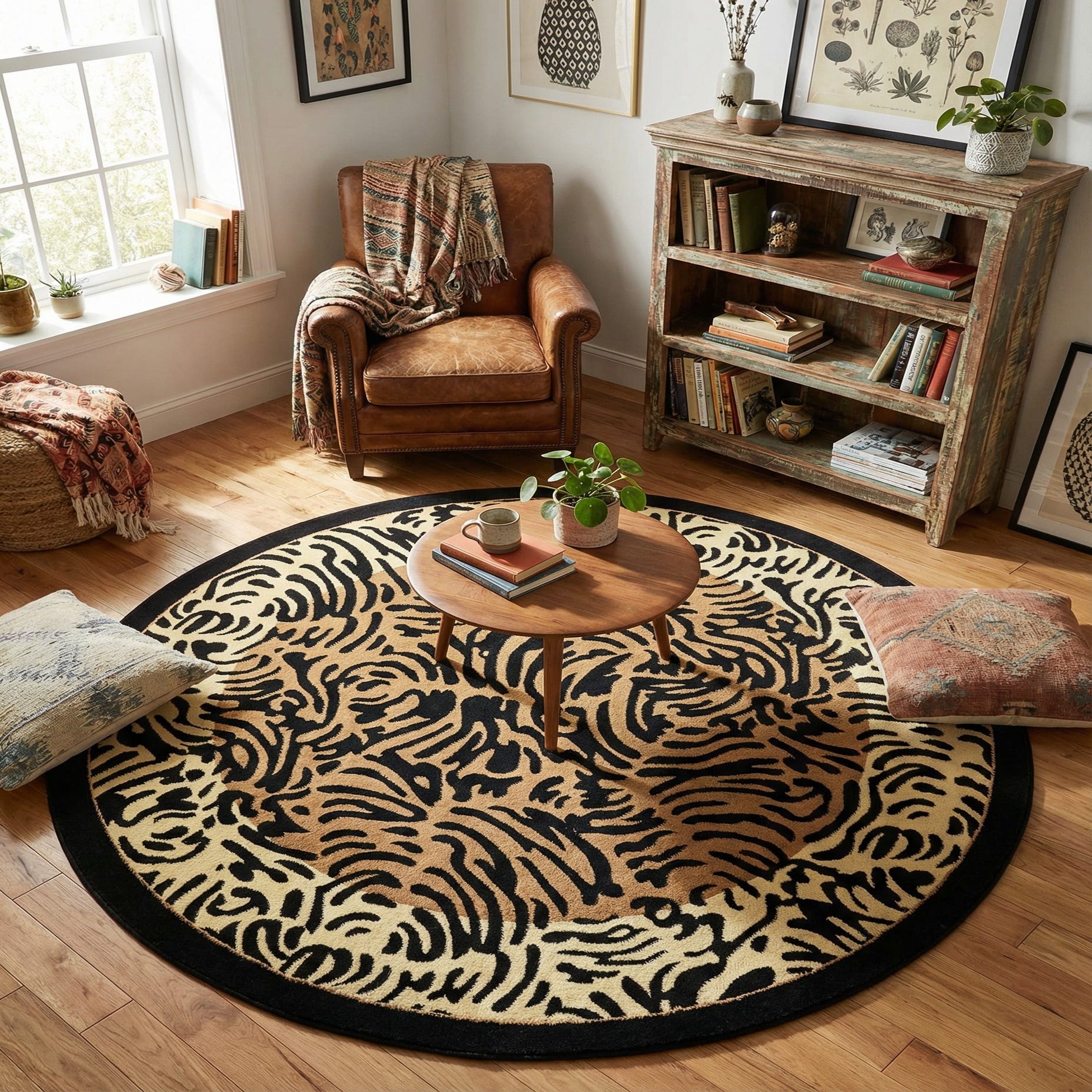 This rug works well beneath a round dining table, as a focal anchor in a seating area, or layered over a larger neutral floor covering to introduce pattern and warmth. Pair it with warm wood furniture and leather seating for a collected, slightly rustic look, or use black metal accents and clean-lined upholstery for a more contemporary setting. It also complements eclectic or safari-inspired interiors, providing a strong graphic element that balances natural textures and simple color palettes.