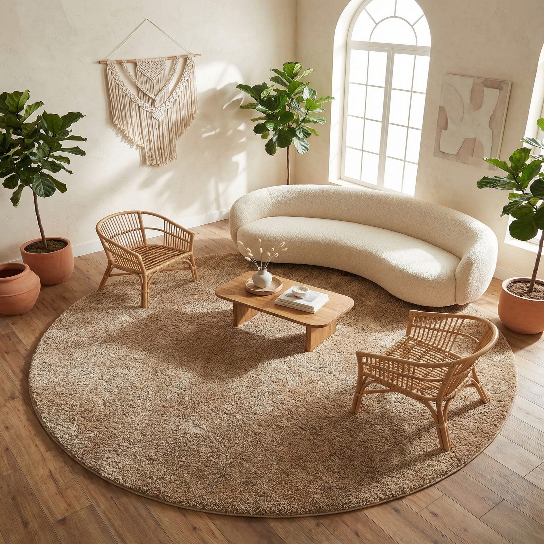 Soft, warm light brown covers a clean, round field with a subtle, low-contrast texture that gives the surface depth without a busy pattern. The dense cut pile is made of slightly twisted fibers, creating a plush, gently lustrous finish that feels soft underfoot and catches light in a calm, even way. The overall look reads as a contemporary neutral — simple and tactile rather than ornate.