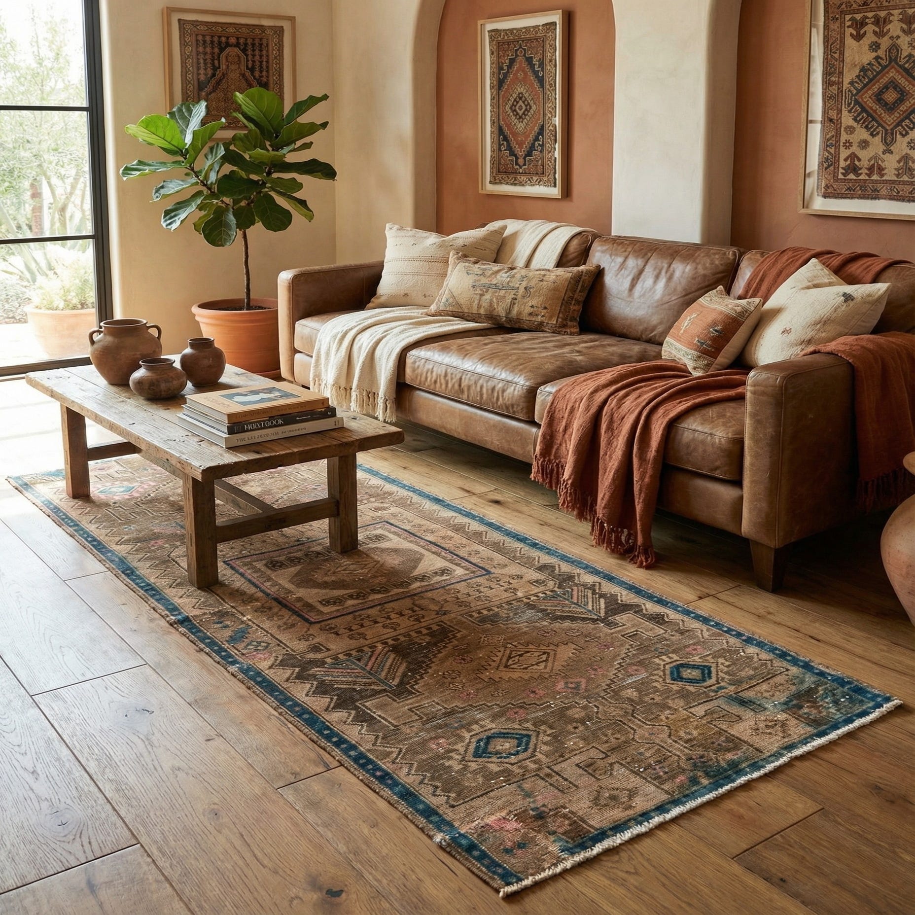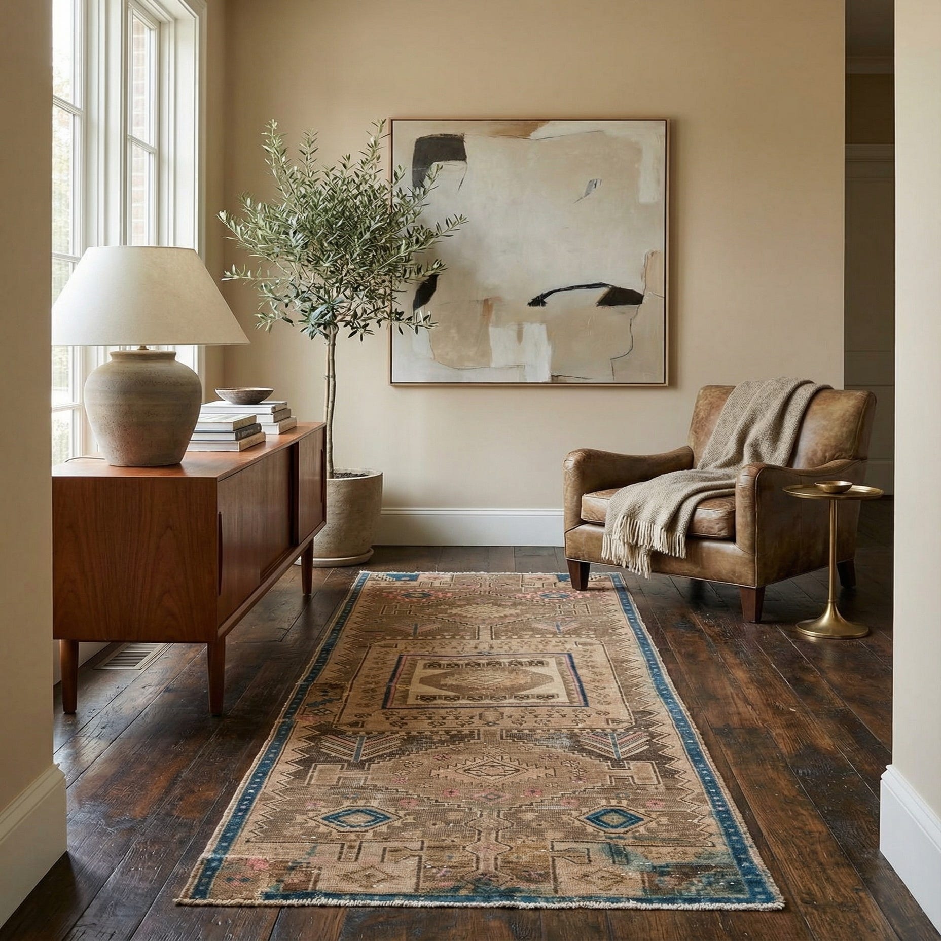 An 8 ft runner rug in shades of brown and tan with a distressed Persian pattern, featuring blue and pink accents.