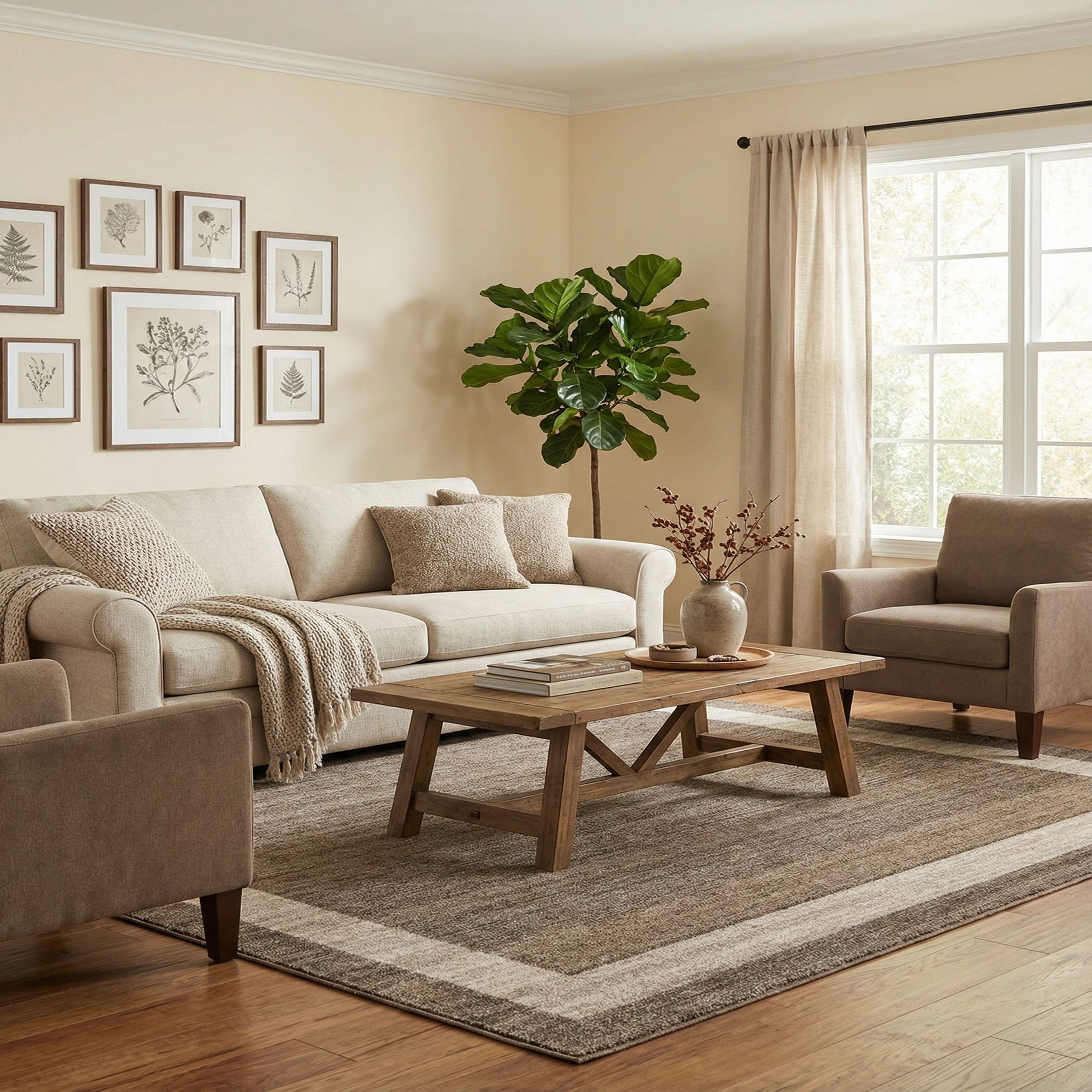 This rug works well centered beneath a seating group or under a square dining table to visually anchor the space. Its neutral light brown and ivory palette pairs naturally with warm wood furniture, leather, or crisp white pieces and fits contemporary, Scandinavian, modern farmhouse, and transitional interiors. Use it to add a calm, grounded layer that complements both relaxed and more structured room arrangements.