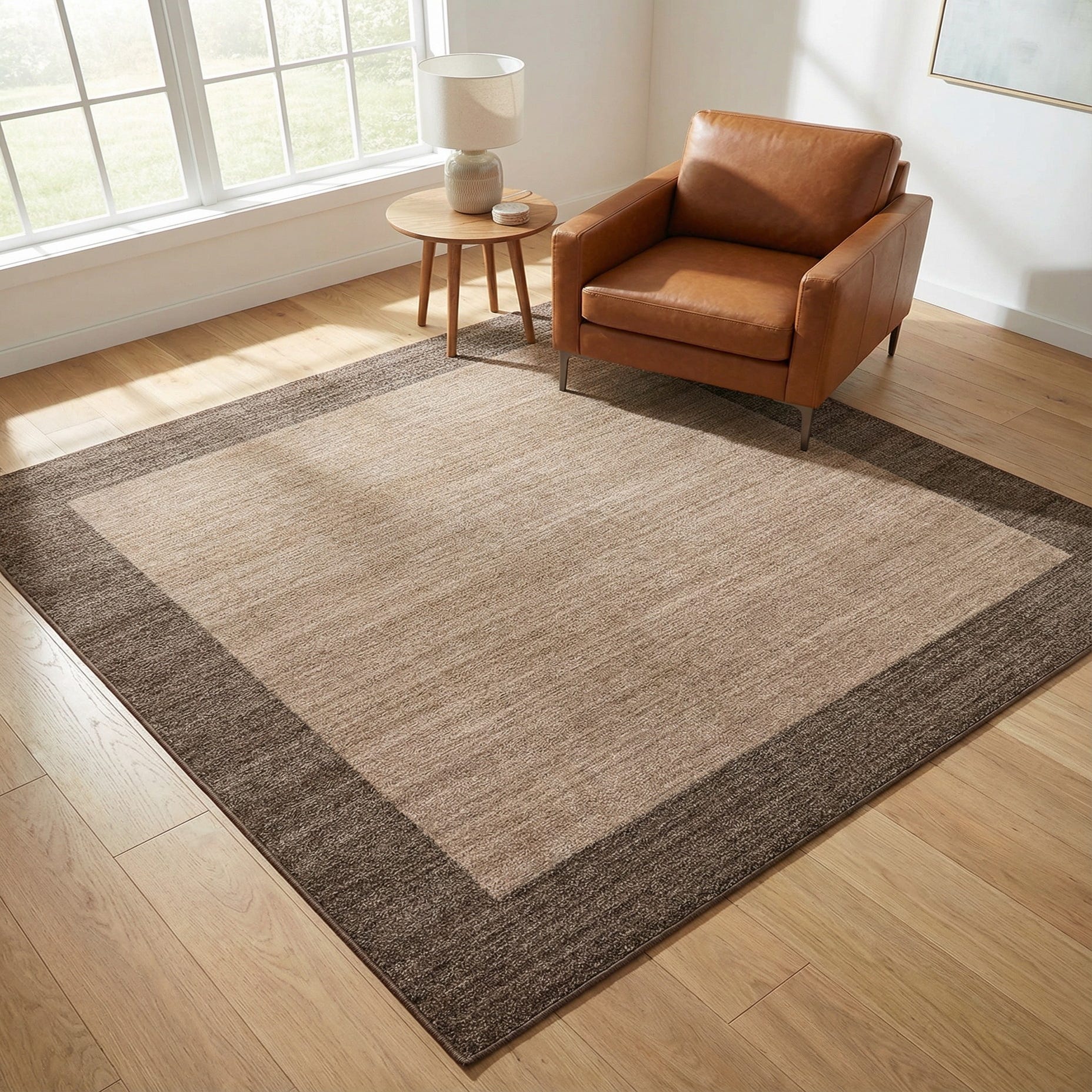 This rug works well as a grounding element in a modern or transitional living room beneath a centered seating grouping, and it complements warm wood finishes, leather upholstery, and neutral linens. It also fits nicely under a square coffee or dining table in compact dining areas, or layered at the foot of a bed to add quiet texture to a bedroom. The restrained palette and simple border make it easy to pair with both minimalist and cozy interiors.