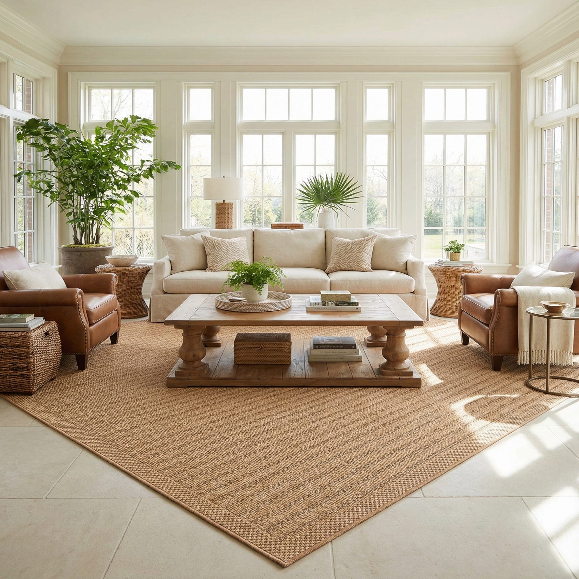 Made from 100% polypropylene, the rug has a firm, slightly textured hand and a low pile that lays flat underfoot. It works well in casual to refined settings — pair it with rattan seating and linen cushions for a relaxed sunroom or patio; place it under a dining table with wood or metal chairs for an easy, grounded dining area; or use it in an entry or mudroom to introduce warm, neutral tones that coordinate with both modern and farmhouse palettes.