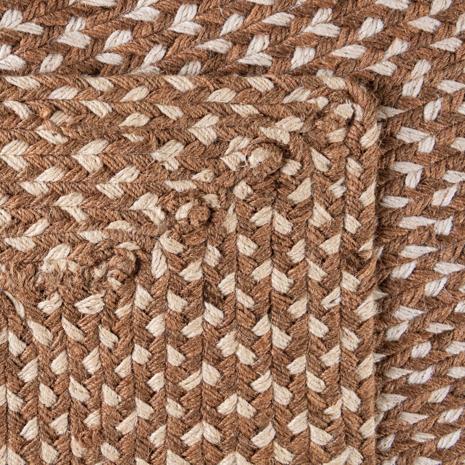 A close-up view of a square Rugs.com Tweed Braided Jute rug, featuring a textured brown and tan modern pattern.