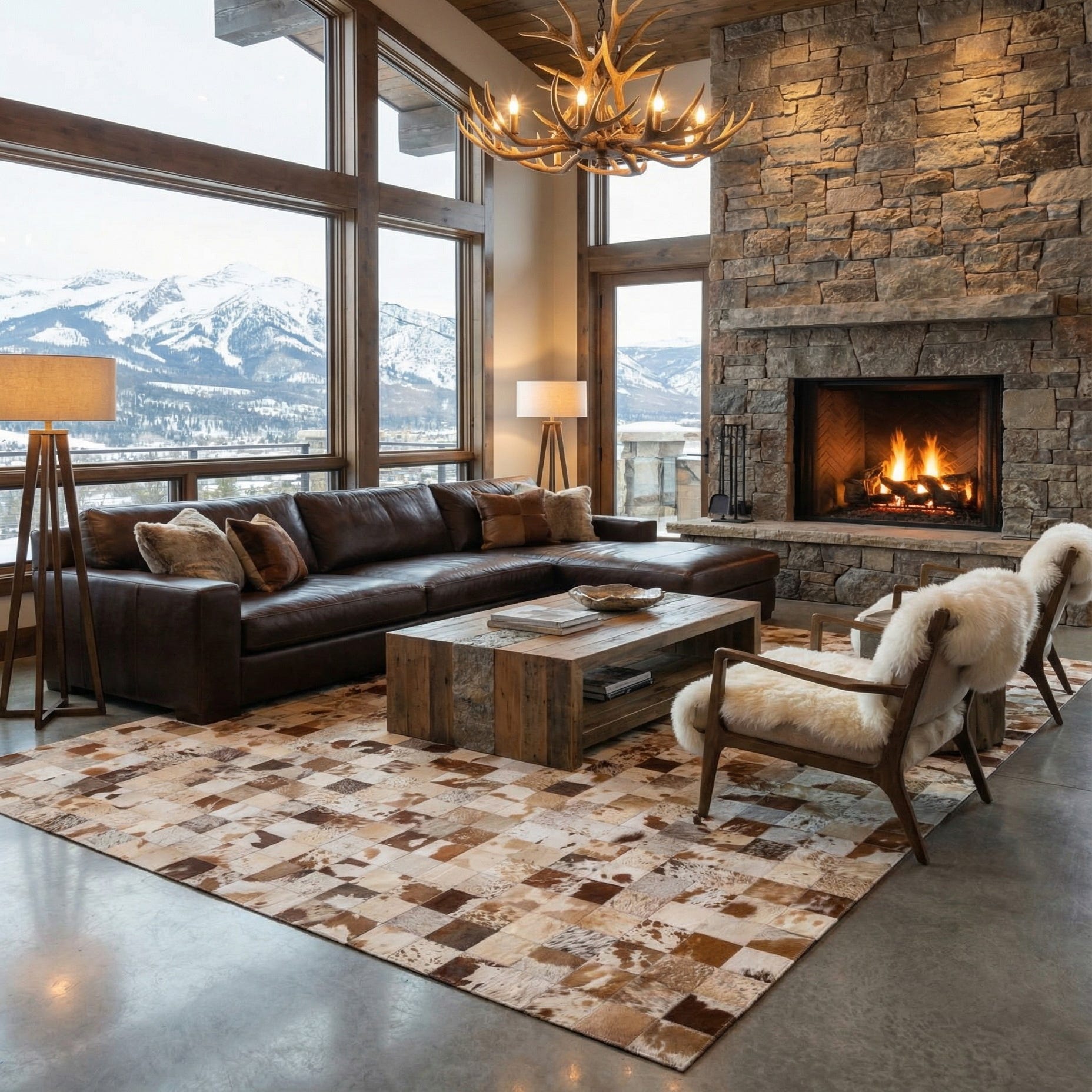 A rectangular 8x10 modern cowhide rug featuring a patchwork of brown and tan squares, perfect for a living room.