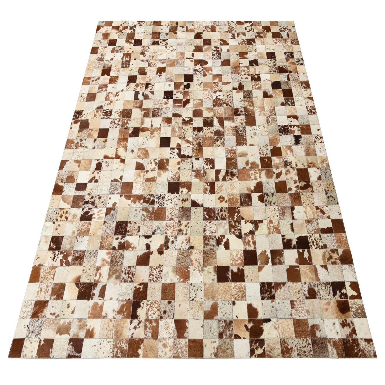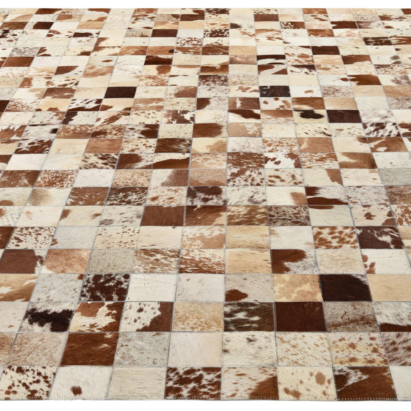 A rectangular 8x10 Cowhide Leather rug featuring a modern checkered pattern in various shades of brown and tan.