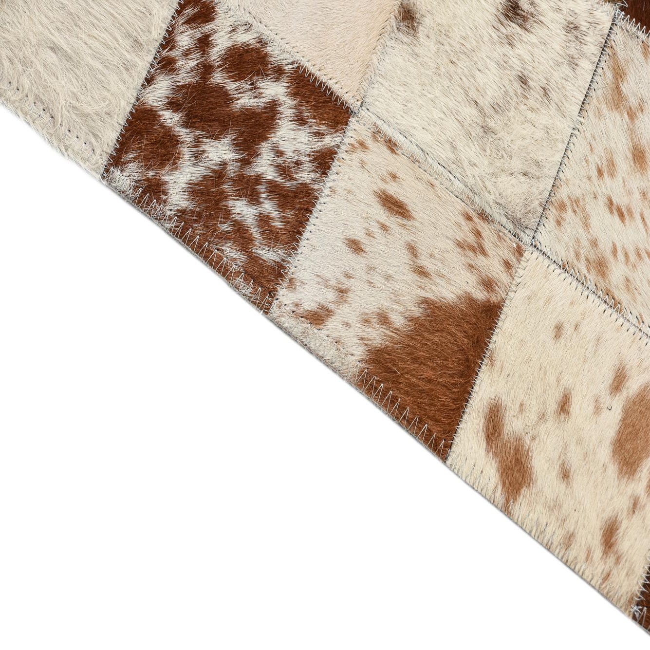 Crafted from genuine cowhide and leather, the Cowhide Leather 8x10 area rug presents a distinctive patchwork design that brings warmth and texture to any space. Its pattern consists of varying squares and rectangles, each showcasing the natural hues and unique grain of the hide. The colors featured within this piece include a range of light brown, beige, brown, ivory, and cream, set against a light brown background that offers a neutral foundation.