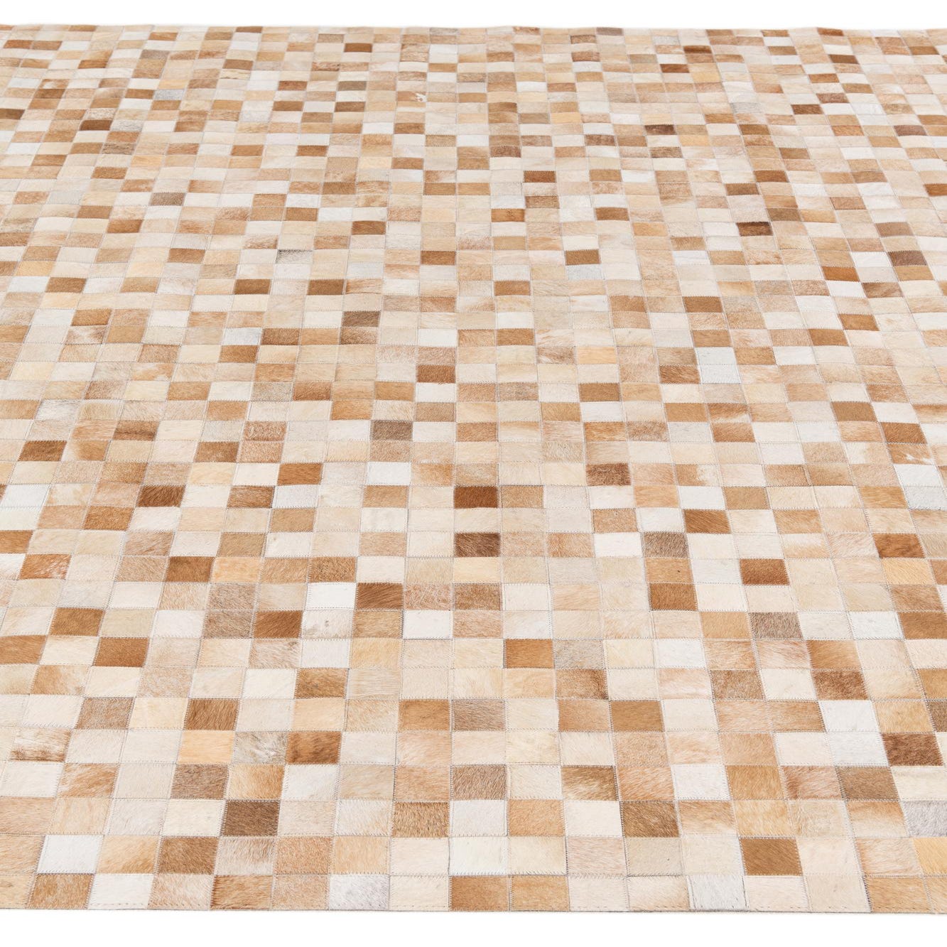 A rectangular 8x10 modern cowhide rug featuring a mosaic pattern of varying brown and tan squares.