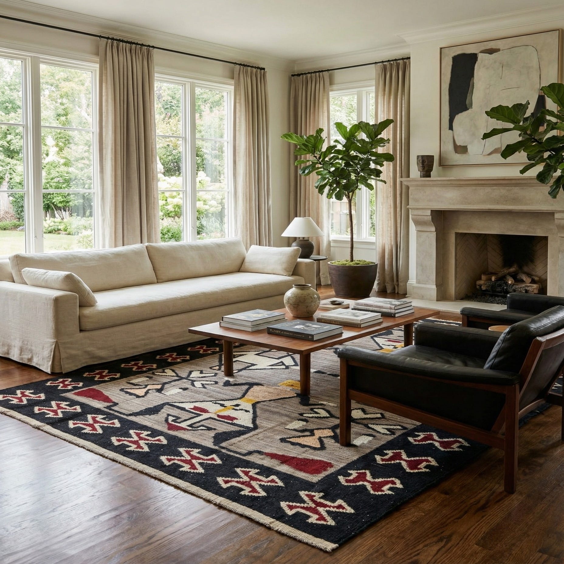 Ideal for interiors seeking to incorporate a statement piece with historic influences, this rug would complement spaces such as a modern living room with clean lines, a traditional study or library space, or even an eclectic bedroom that embraces a mix of patterns and textures. It serves as a sophisticated focal point that anchors furniture while adding warmth and visual interest to the room.