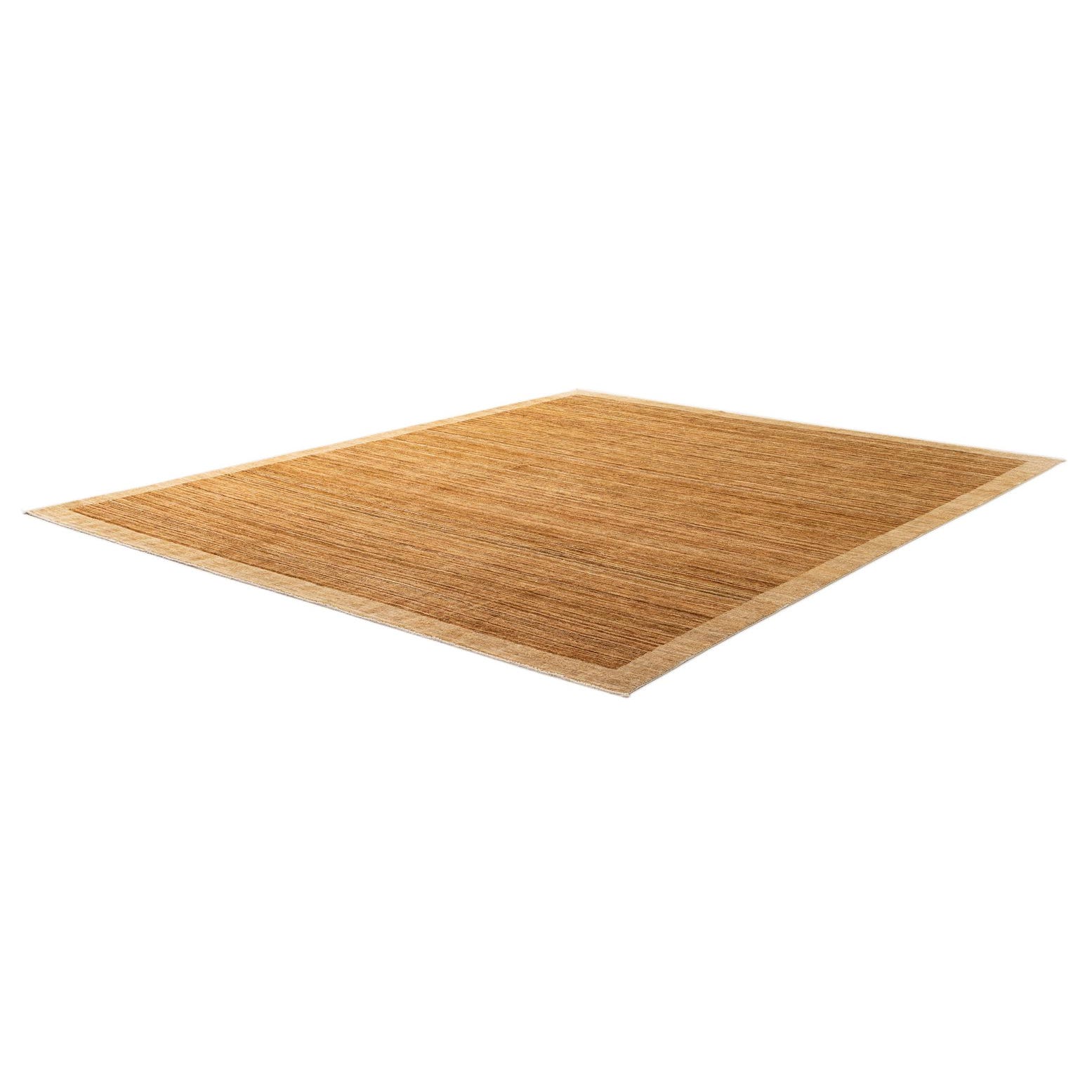 A rectangular 8x10 Modern Ziegler wool rug in varying shades of brown and tan with a subtle striped pattern and a lighter border.