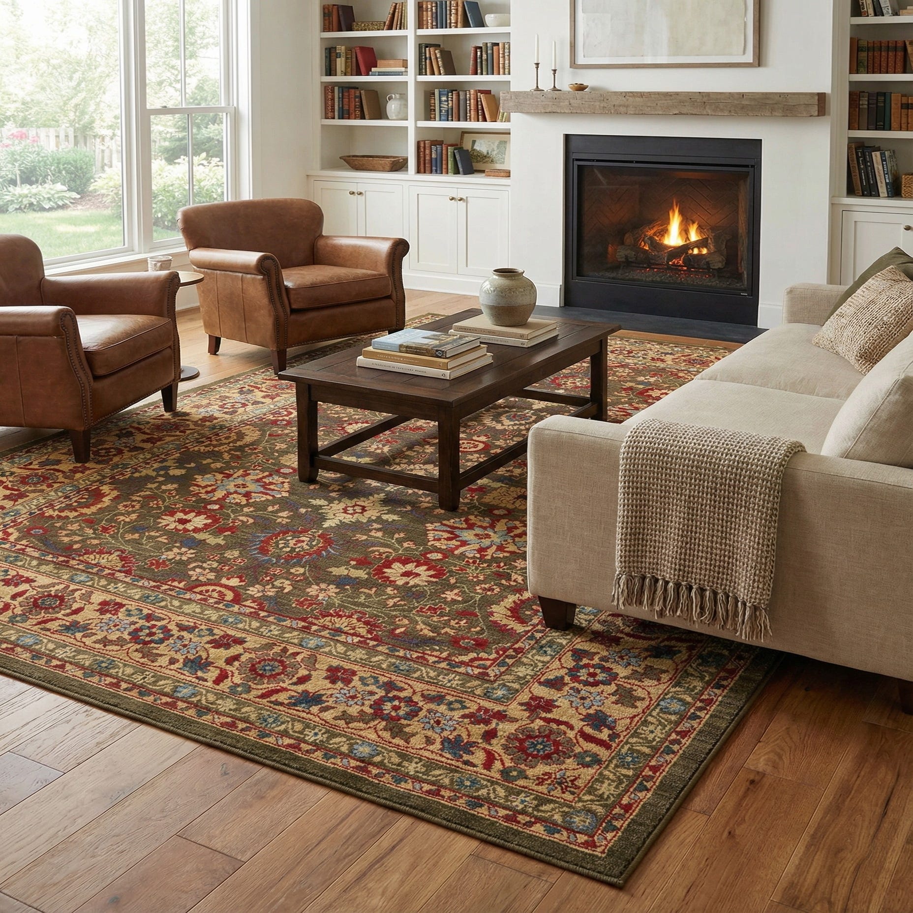 A rectangular 8x11 Chelsea Collection rug featuring a rich brown and tan traditional floral pattern with red and blue accents.