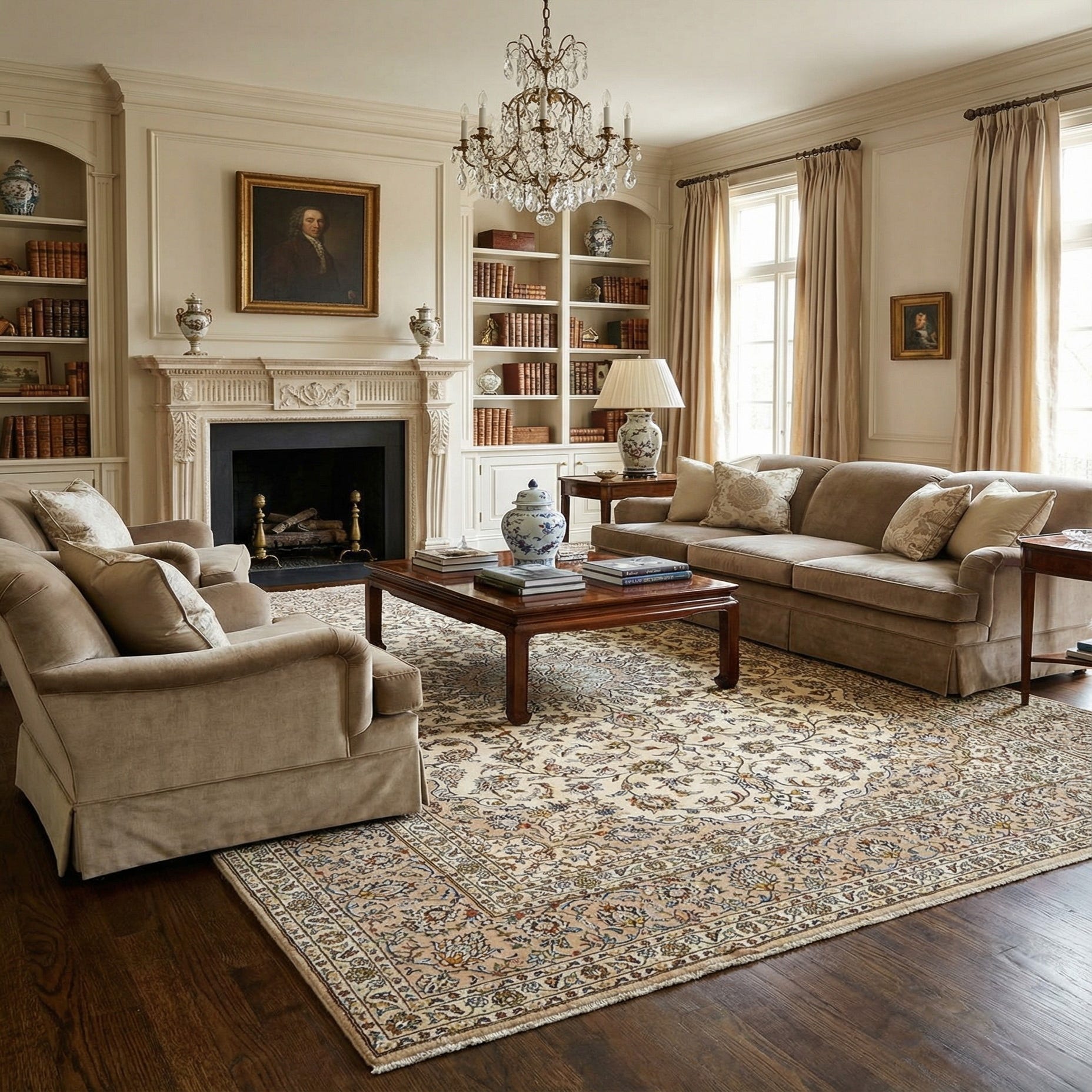 This rug works well as an anchoring piece in a formal living room or dining area, beneath a solid wood table to bring warmth to hardwood floors. It also pairs comfortably with a transitional bedroom scheme—layer it under the bed with neutral linens and a few blue or green accent pillows to tie in the colors. Equally suited to a study with leather seating or a relaxed, traditional family room, it complements both antique furnishings and more contemporary pieces while adding a tactile, handcrafted quality to the space.