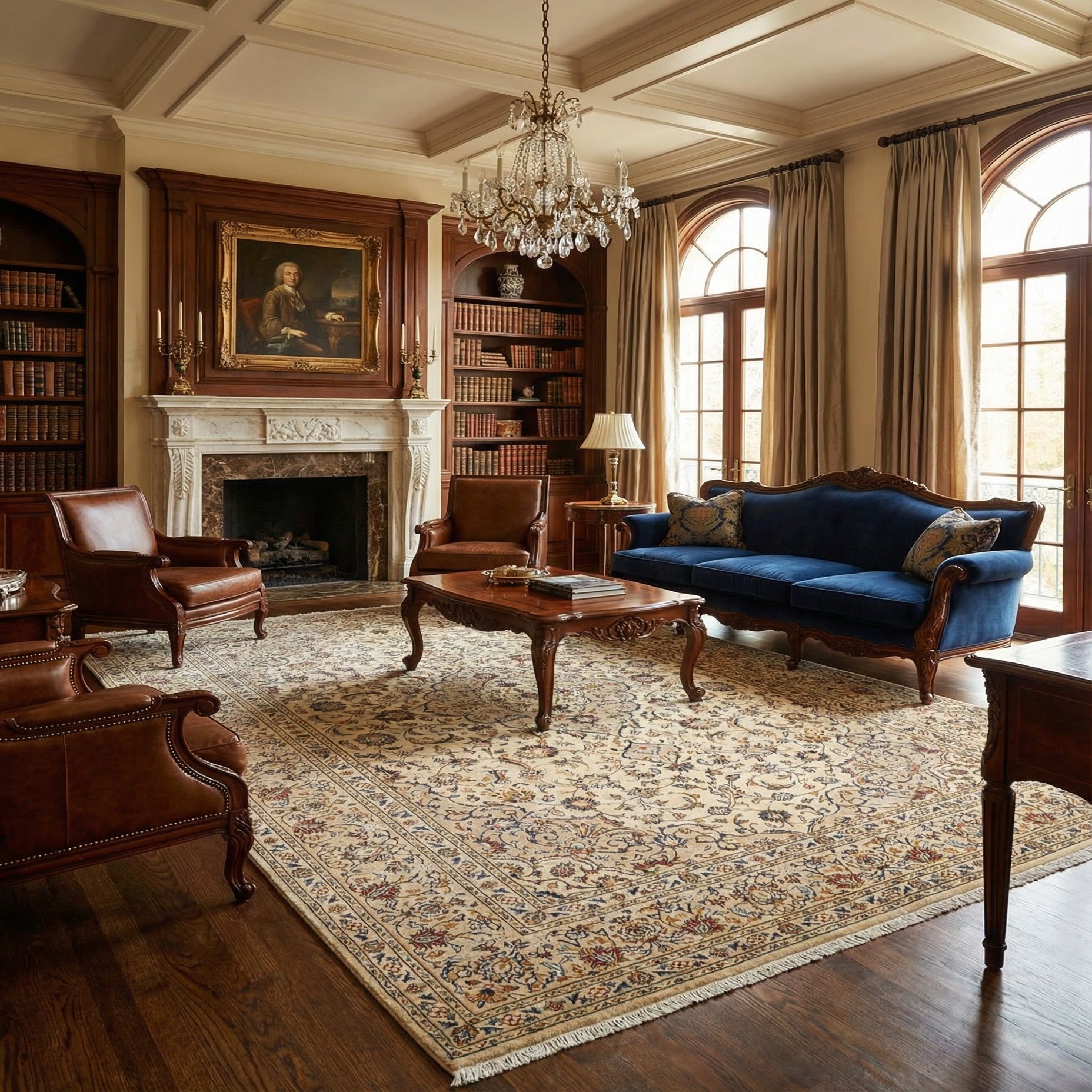 An 8x11 rectangular Kashan Persian rug in browns and tans, featuring intricate floral and medallion patterns, ideal for a living room.
