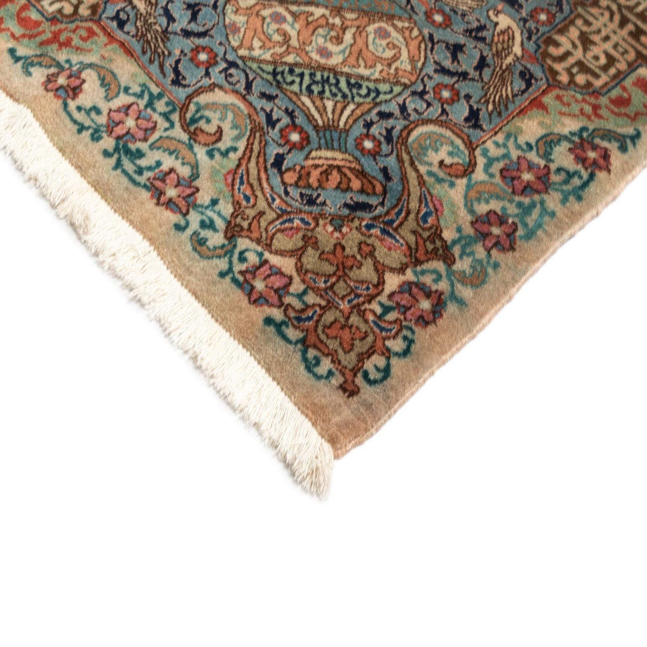 An 8x11 rectangular Kashmar Persian wool rug featuring an intricate traditional medallion and border design in shades of brown, tan, blue, and rust.