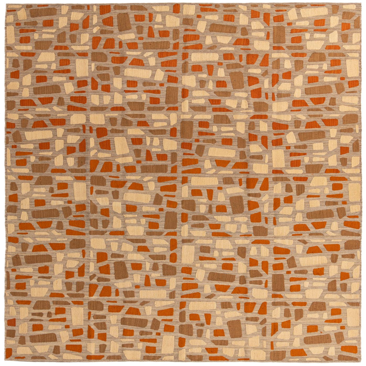 The Kilim Modern collection presents a handwoven wool and silk rug sized at 8x11, capturing the essence of contemporary design with a nod to traditional craftsmanship. The rug features an abstract pattern with a tessellation of geometric shapes, harmoniously blended in a palette of light brown, terracotta, beige, and brown. The light brown background provides a subtle canvas that allows the terracotta and beige accents to create a dynamic visual interest.