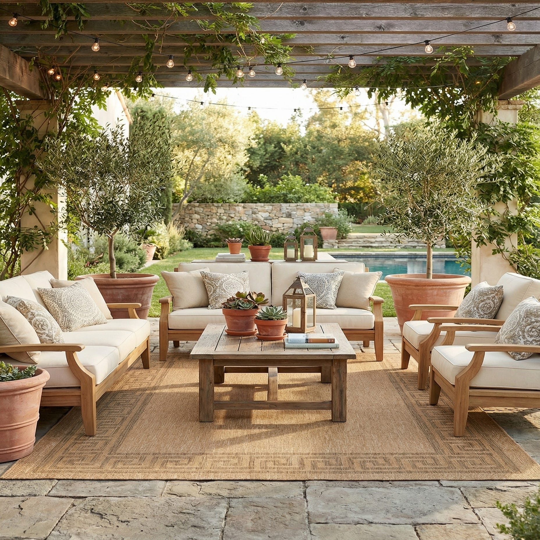 This piece fits well on covered patios, sunrooms and entryways where a durable, refined look is needed, or inside under a casual dining table or layered in a living room with warm woods and natural linens. Its neutral brown tones and traditional border make it a sensible choice for coastal, Mediterranean, or transitional interiors that favor clean lines and earthy palettes.