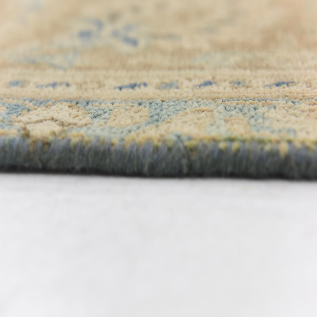 The rug's all-wool construction ensures a luxuriously soft texture that contributes to its appealing aesthetic, providing both comfort and durability. With its classic and sophisticated pattern, this rug is versatile for various interior design applications, seamlessly fitting into settings that range from traditional to transitional. Its subdued yet inviting color palette makes it an excellent anchor for living rooms, dining areas, or as a statement piece in bedrooms. The subtle blues within the design could be complemented by similar or contrasting hues in home furnishings, while the neutral tones provide a canvas to build upon with various textures and accessories.