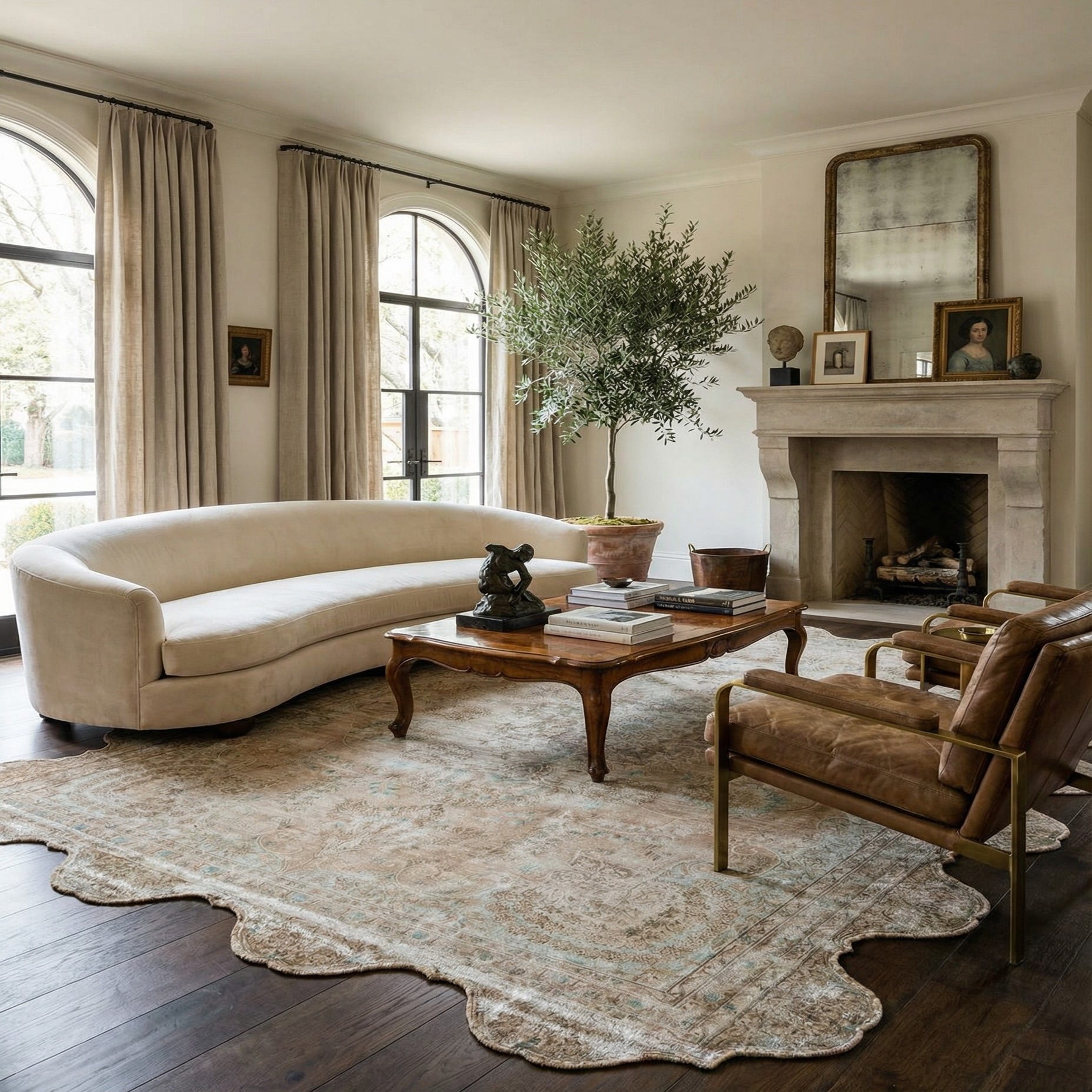 An 8x12 rectangular Ultra Vintage rug with a distressed Persian medallion pattern in browns, tans, and light blue accents, featuring a unique scalloped edge.