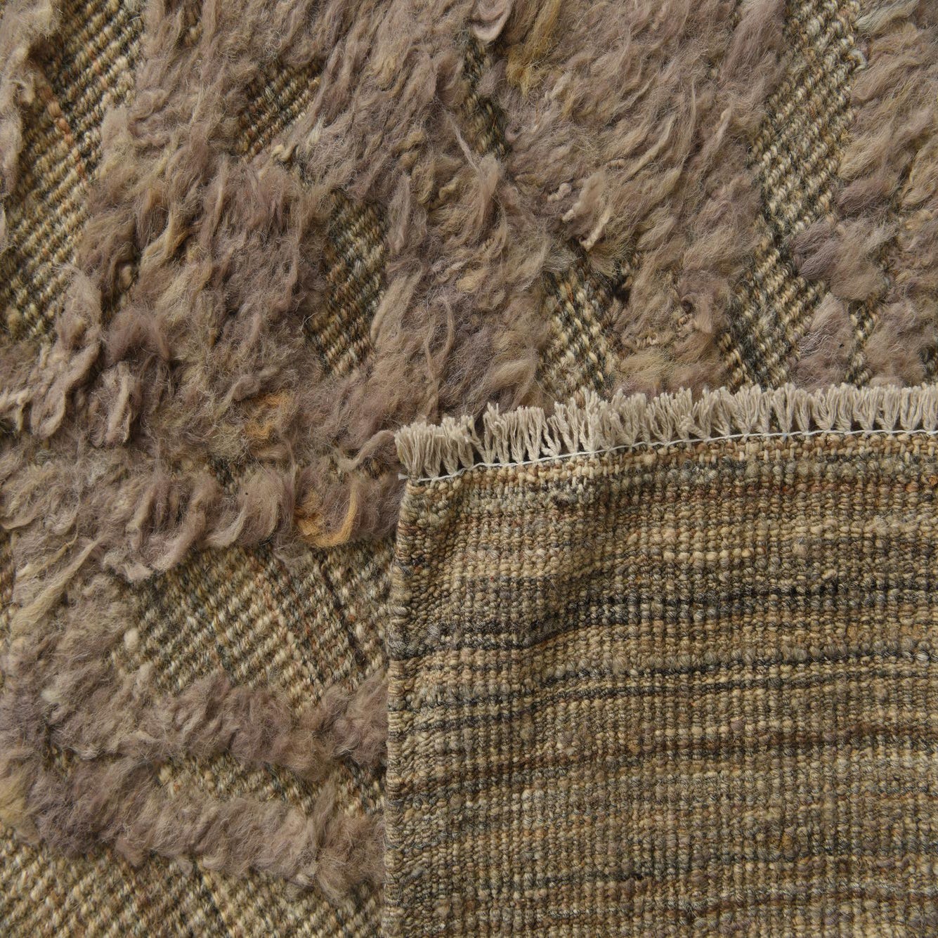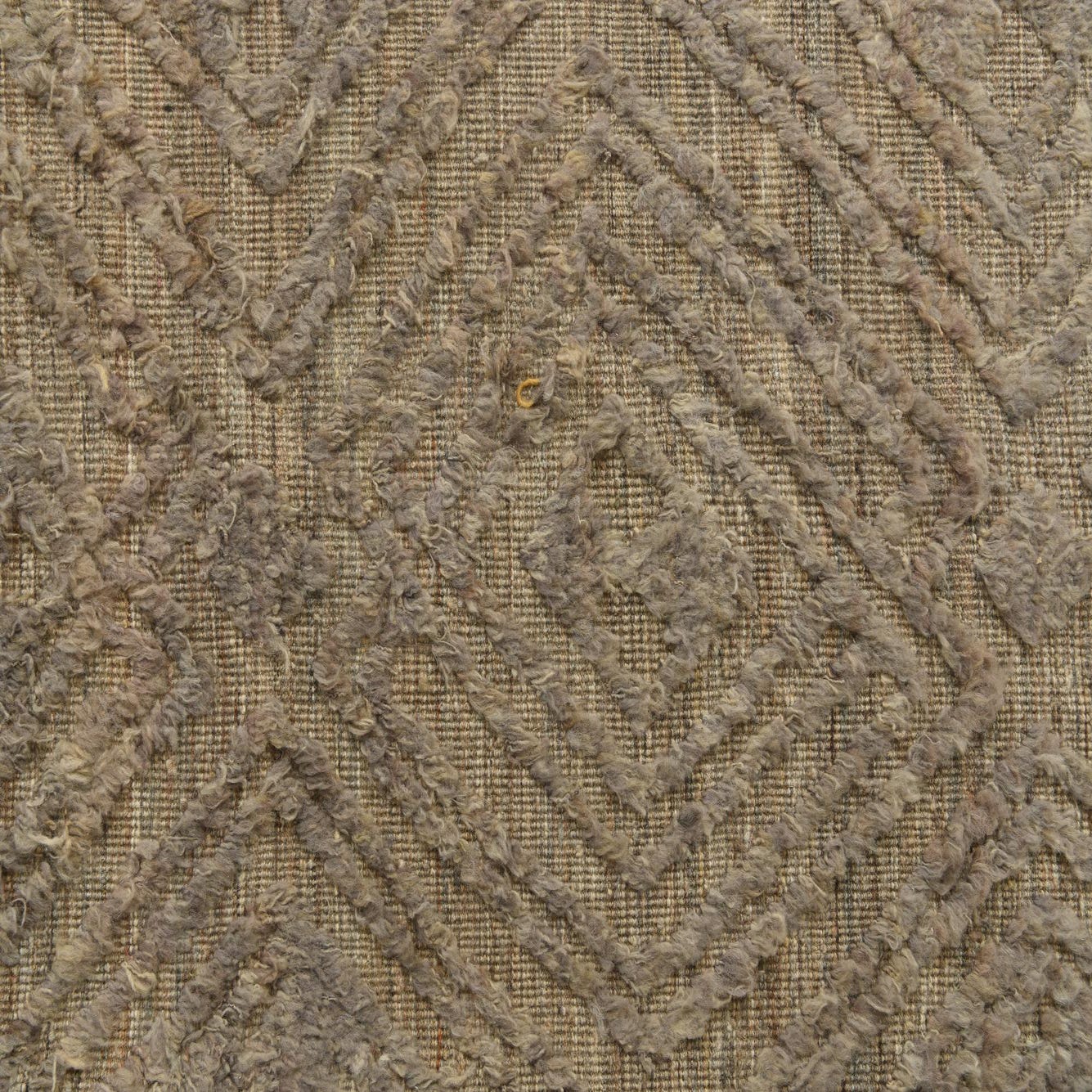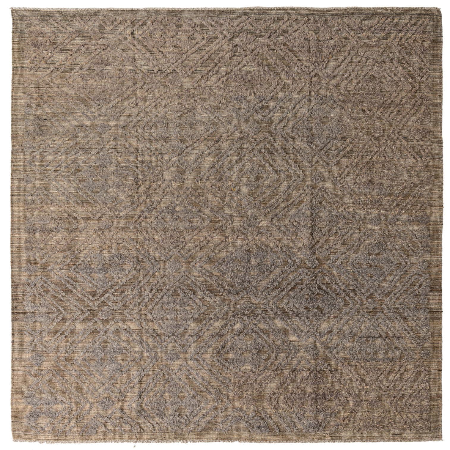 Hand-knotted from 100% wool, this rug presents a light brown ground punctuated by a geometric diamond pattern in beige and gray. The design is rendered with a low foundation and a raised, sculpted pile that you can feel beneath your feet—each diamond has subtle depth and a soft, tactile quality. Natural color variation in the wool creates gentle striations across the field, giving the surface a layered, lived-in look without heavy contrast.